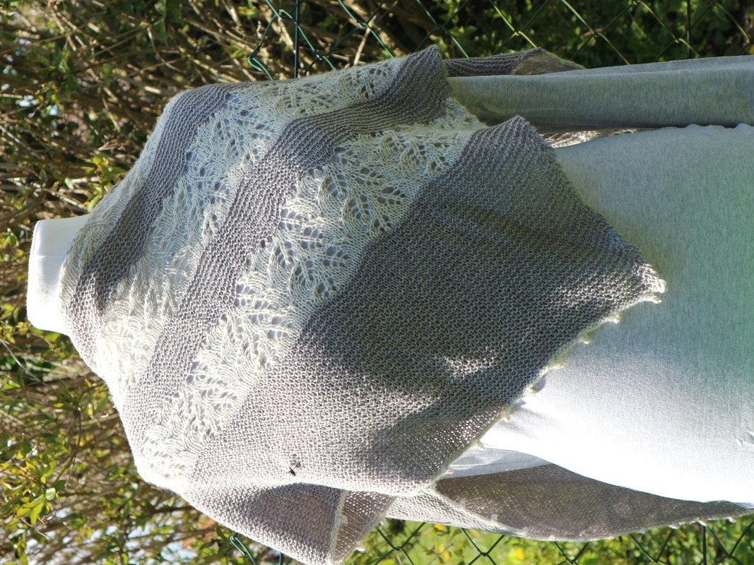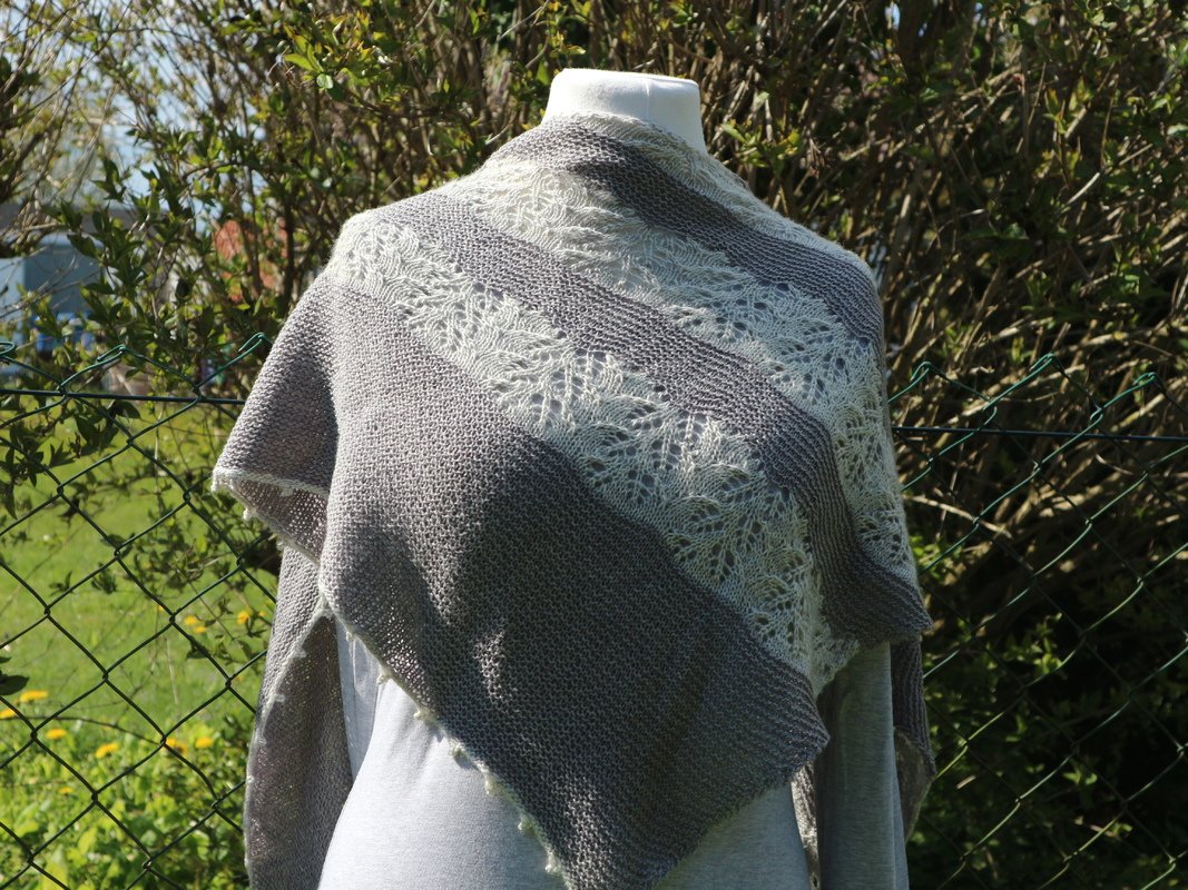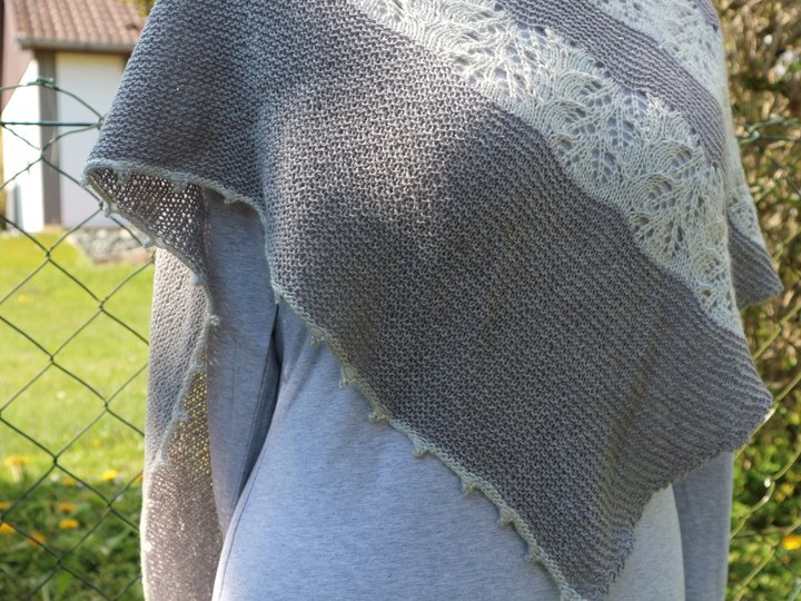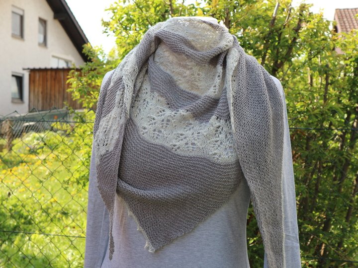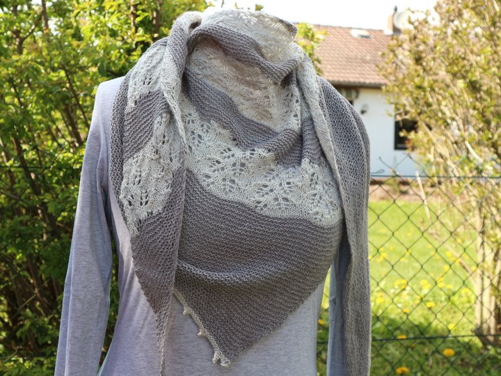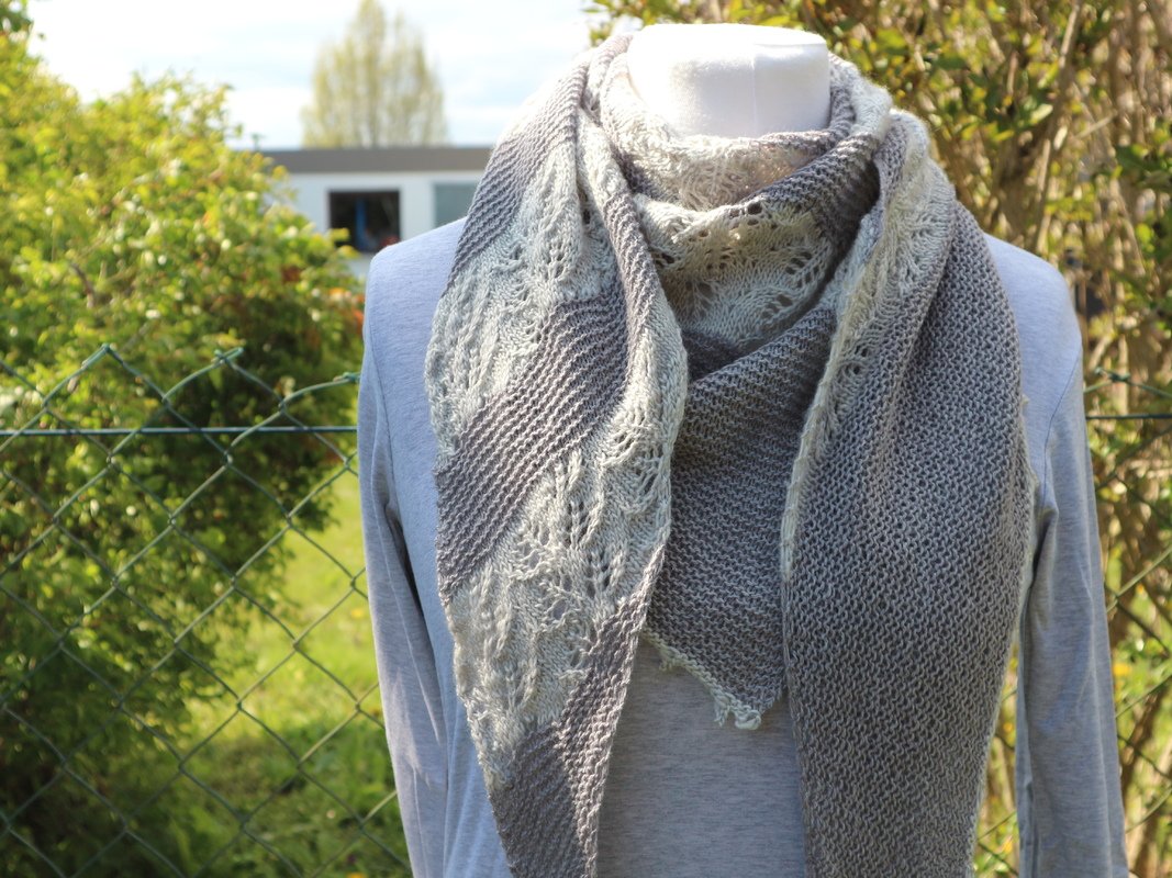 Mit dem Garn könnt Ihr eurer Phantasie freien Lauf lassen. Entweder, Ihr strickt das Tuch wie abgebildet oder einfarbig. Genauso können aber auch die kraus rechts gestrickten Teile in mehreren Farben gearbeitet werden oder Ihr setzt beim Lacemuster Akzente.