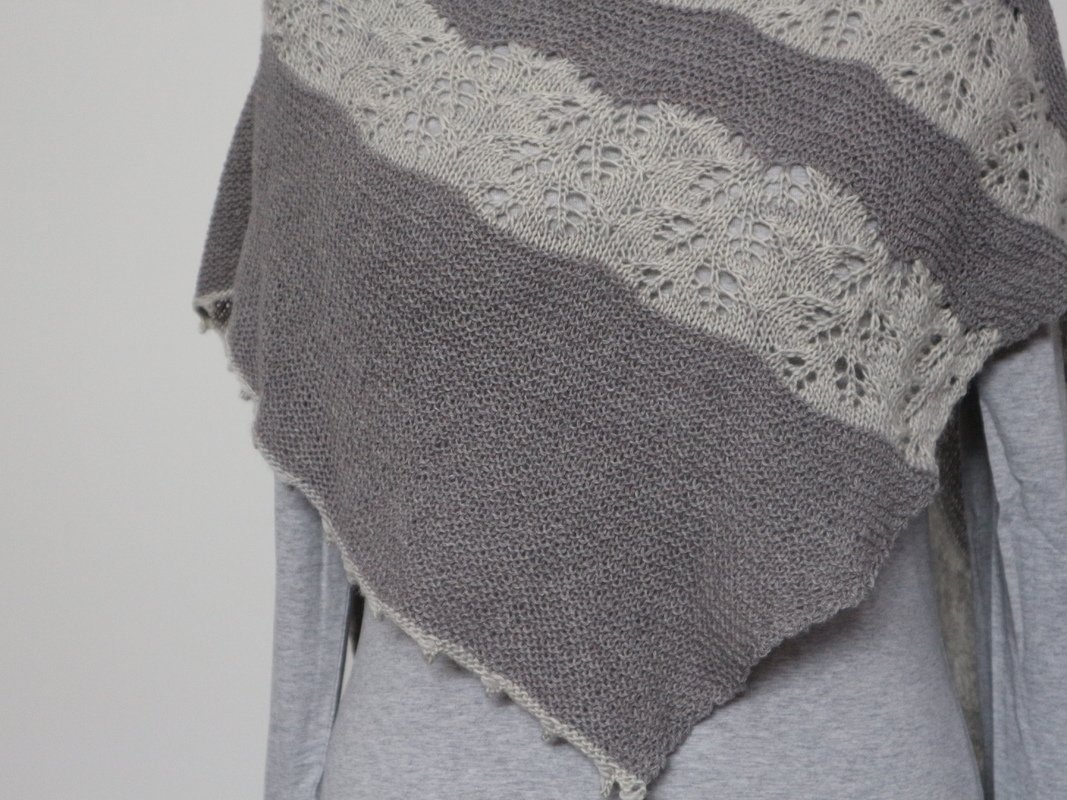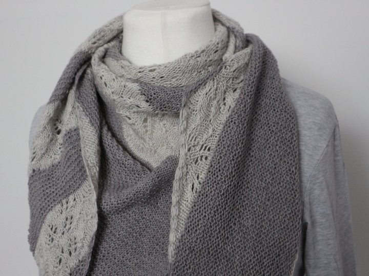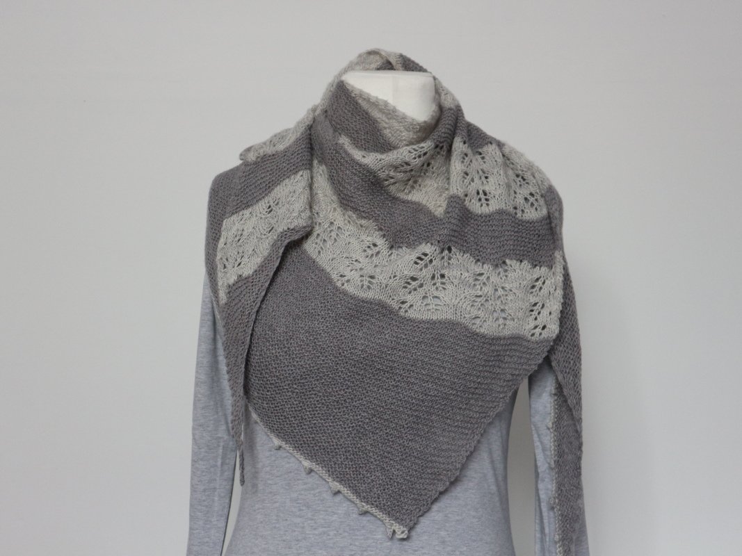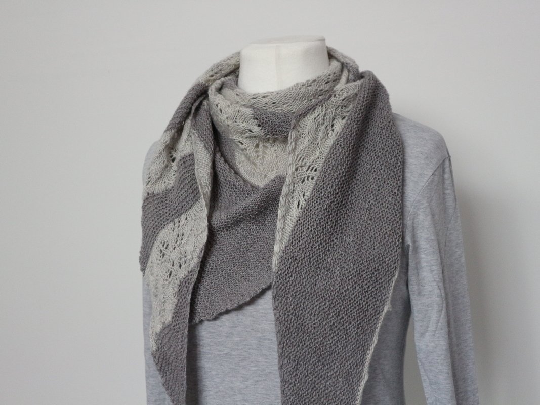 Garn: Farbe A: Holst Garn Coast / grau (50g / 350 Meter) 2 Knäul, Farbe B: Madelinetosh Merino Light / creme (100g / 440 yards / 402 Meter) 1 Strang.