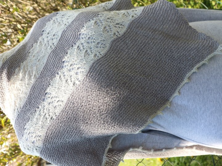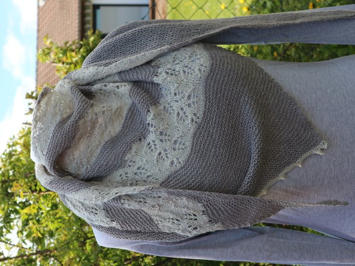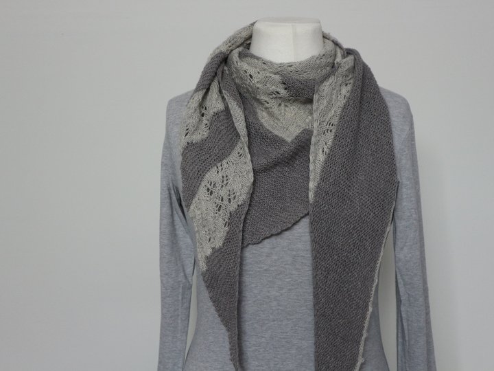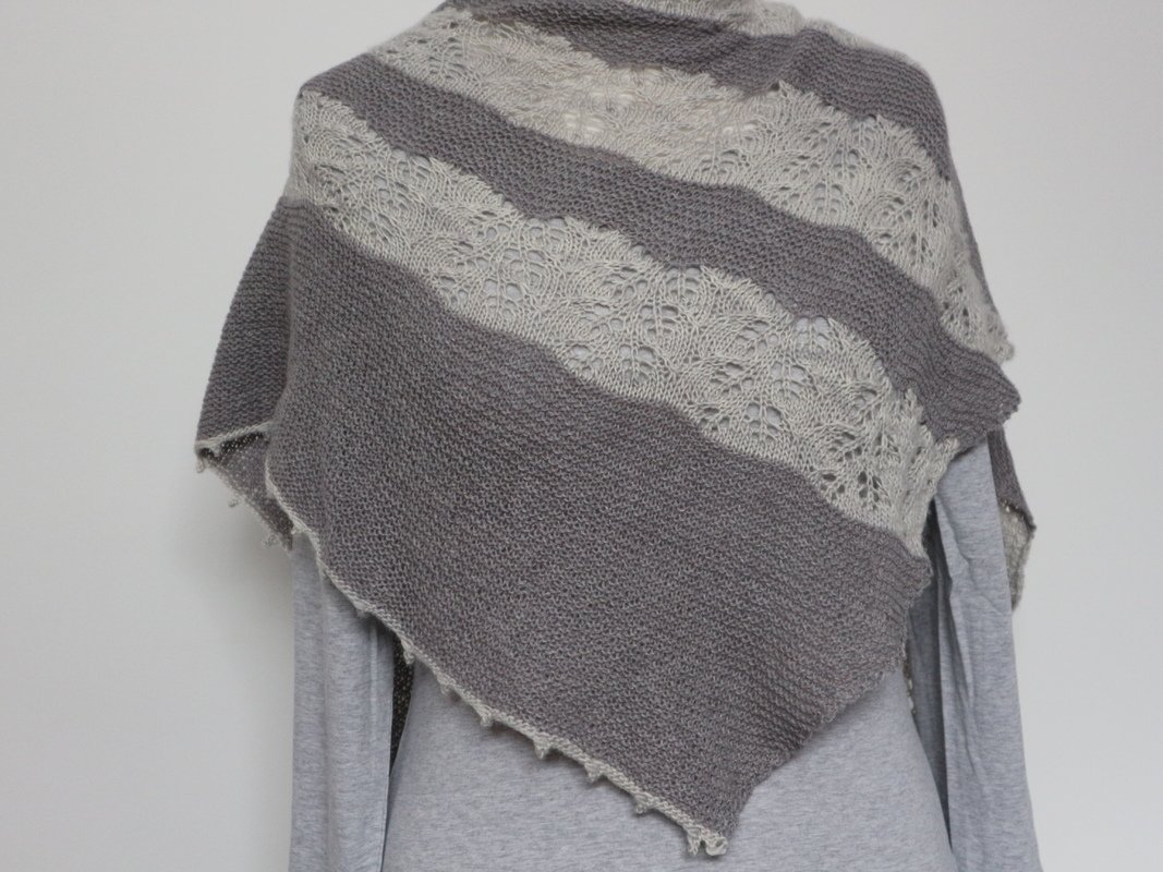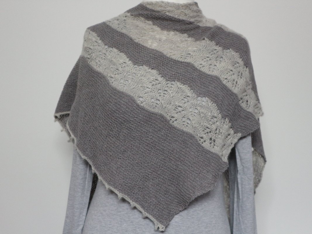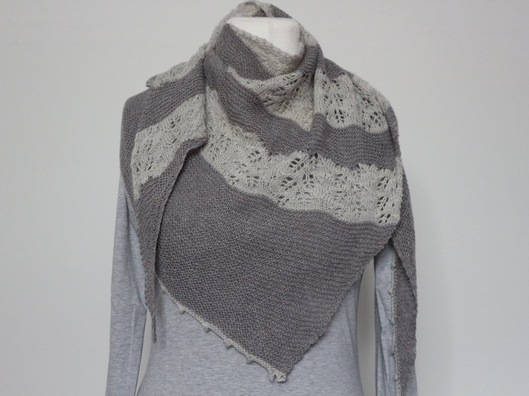 Dieses Tuch ist Romantik pur! Das zarte Lacemuster, dass abwechselnd mit einem kraus rechten Teil gestrickt wird, ist einfach nachzuarbeiten und wird nur auf der Vorderseite gestrickt. In den Rückreihen werden alle Maschen links gearbeitet. Am Ende wird mit einem Picot Rand abgekettet, der dem Tuch noch den zarten romantischen Touch verleiht.