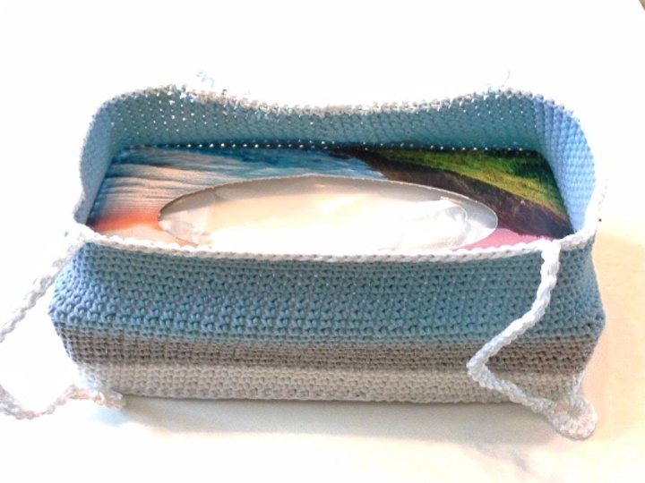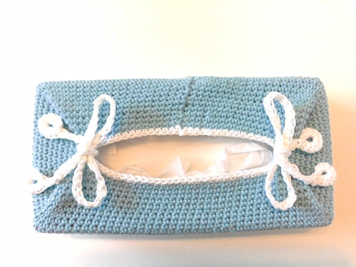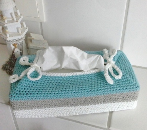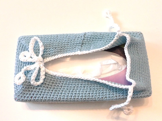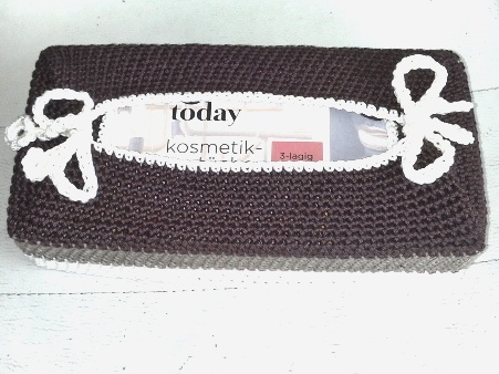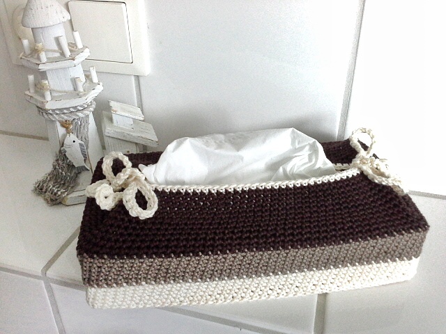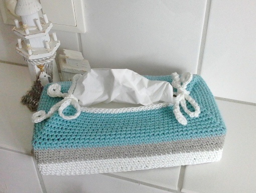 Die Bindebänder werden in der letzten Reihe mit eingehäkelt. Zum Schluß wird die Hülle über die Box gezogen, die Seiten nach innen geklappt und die Bändchen zur Schleife gebunden. Es sind keine Nähte nötig.