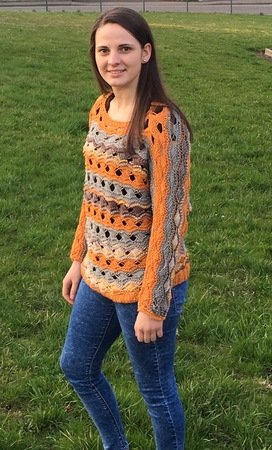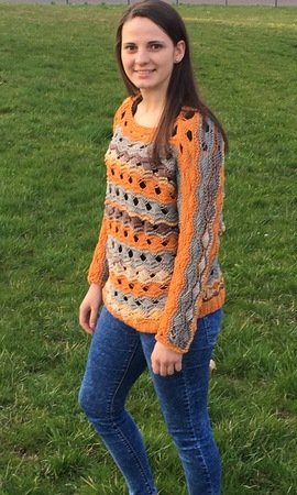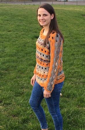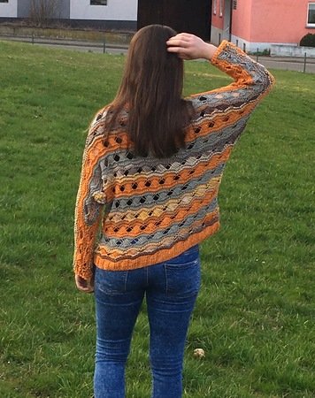 Der Pulli ist aus zwei Uni-Farben und 1 farblich abgestimmten Color-Farbe aus Bändchengarn gearbeitet. Verkreuzte Fallmaschen geben ihm seinen besonderen Effekt und sorgen für raffinierte Durchblicke. Alle anderen Maschen werden nur rechts gestrickt, so dass beim Stricken immer mal wieder eine Erholungsphase eingelegt werden kann.