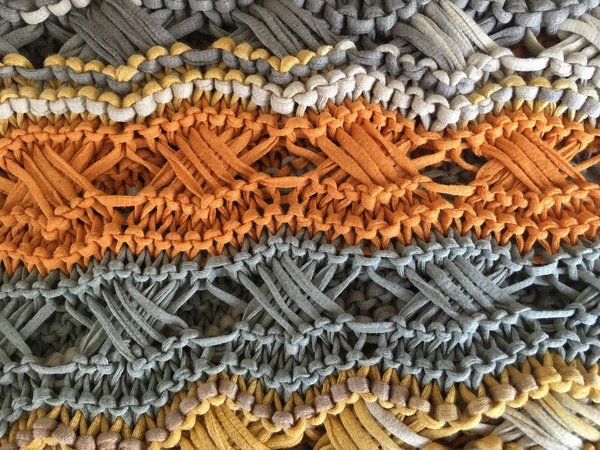 Material: je 200 (200) 300 g Schlamm und Curry „Woolly-Hugs – BANDY UNI“ (100% Baumwolle, LL = 210 m/100 g) sowie 200 (200) 300 g Senf-Braun-Color „Woolly-Hugs – BANDY COLOR“ (100% Baumwolle, LL = 210 m/100 g), jeweils Langendorf & Keller