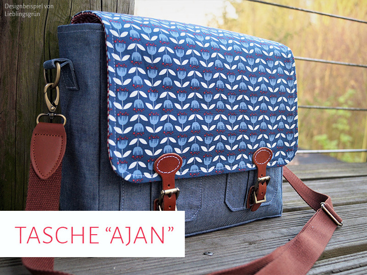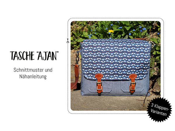 Die Umhängetasche Ajan ist dein idealer Begleiter für die Uni, im Büro oder zum Einkaufen. Durch die Reißverschlusstasche auf der Rückseite und in der Innentasche kannst du wichtige Dinge sicher verstauen. Die Tasche ist sehr geräumig und durch die aufgesetzten Außentaschen hast du noch viel mehr Verstaumöglichkeiten. Die Träger sind längenverstellbar, sodass du die Tasche perfekt auf deine Bedürfnisse anpassen kannst. Im Schnittmuster kannst du aus drei verschiedenen Klappenformen wählen: gerade Kanten, abgerundete Ecken oder abgeschrägte Klappe. Die aufgesetzten Taschen lassen sich aus Baumwollstoff oder aus nicht fransendem Stoff nähen. Auch bei den Trägern hast du die Wahl und kannst sie entweder aus Gurtband oder aus nicht fransendem Stoff mit Buchschrauben nähen. Alle Varianten und Möglichkeiten sind im Schnittmuster enthalten und werden genau erklärt.