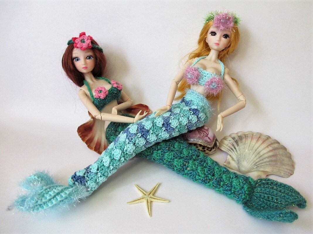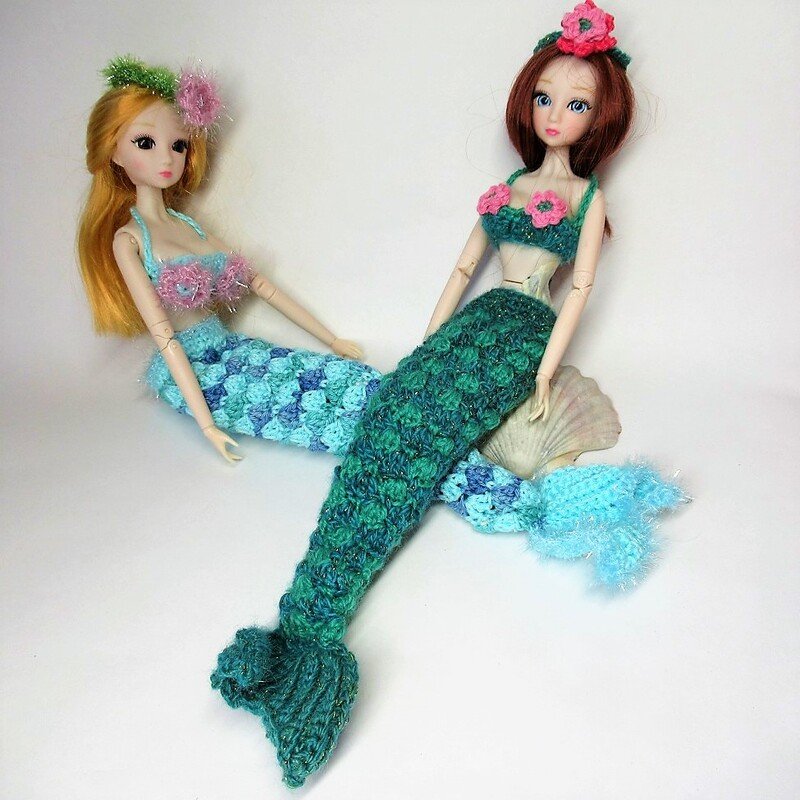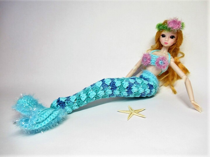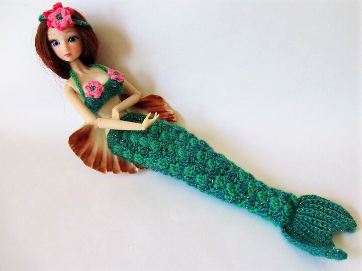 Hier ist die Häkelanleitung für ein komplettes Meerjungfrauen Outfit für deine Ankleidepuppe: Fischschwanz, Oberteil und Haarschmuck.