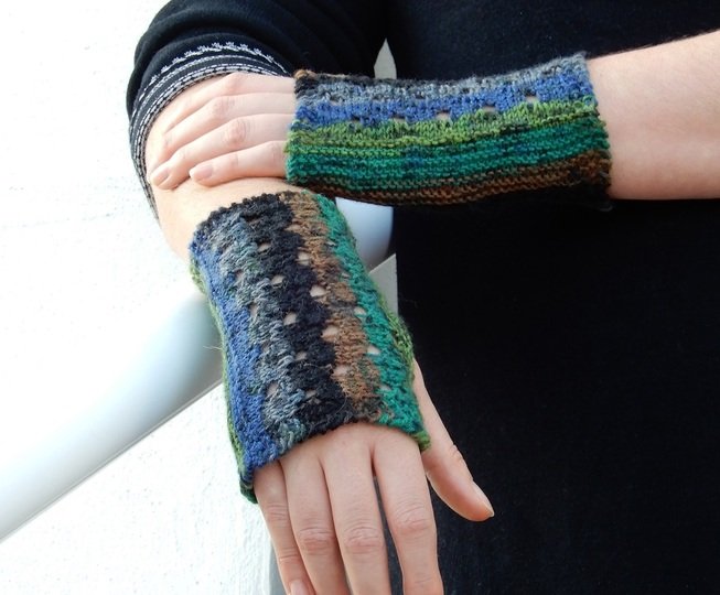 Diese Pulswärmer werden seitwärts in einer 4-fädigen Sockenwolle gestrickt. Der Handrücken hat ein Muster mit dekorativen kleinen Löchern, während die Handinnenseite kein Muster hat.