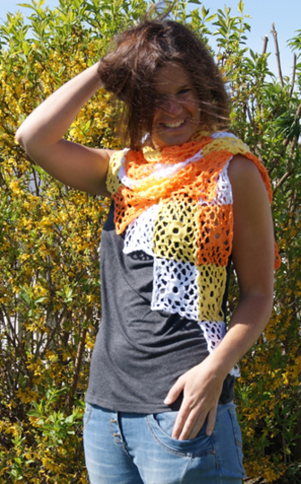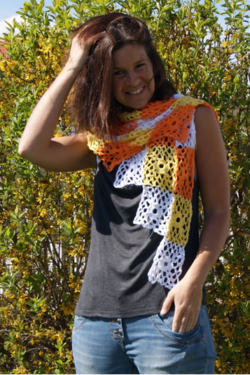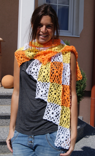 Farben: weiß, gelb, orange je 100 g (= 2 Knäuel, wobei ca. je ½ Knäuel Rest bleibt für das angeführte Maß)