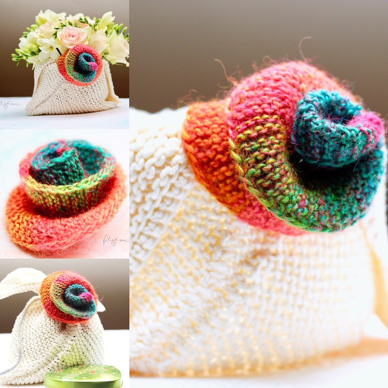 ROSI-COSI gibt dem Ganzen einen romantischen Farbtupfer! Dieser Beutel im japanischen Bento-Style ist ganz einfach zu stricken und bekommt erst durch das Zusammennähen seine etwas außergewöhnliche Form! Er ist äußerst vielseitig einsetzbar, ob als Vasen-Husse für's Marmeladenglas, Osterkörbchen oder einfach als Geschenkverpackung… Bei der Ausgestaltung könnt Ihr Eurer Fantasie freien Lauf lassen: Ob ganz schlicht nur mit einer Kordel gebunden, mit einer schönen Schleife verziert oder mit einer opulenten Strickrose im Farbverlauf, Muscheln, Knöpfen, Blümchen, Applikationen, oder mit bunten Fransen am Rand… Alles ist möglich! Die Strickanleitung ist für den Beutel und die Strickrose beschrieben, inklusive Fototutorial !