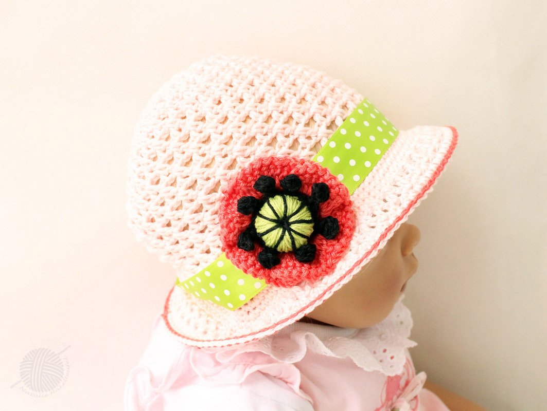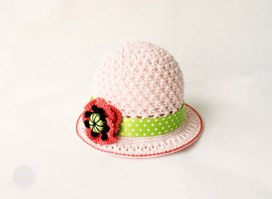 PDF-Anleitung besteht aus bebilderter Anleitung zum Häkeln von einem Kinderhut (mit kurzer und langer Krempe) mit einer Mohnblume für Frühling und Sommer.
