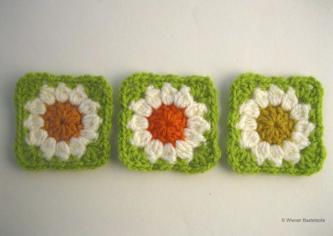 3. die 3 Granny Squares in (händisch geschriebener) Häkelschrift