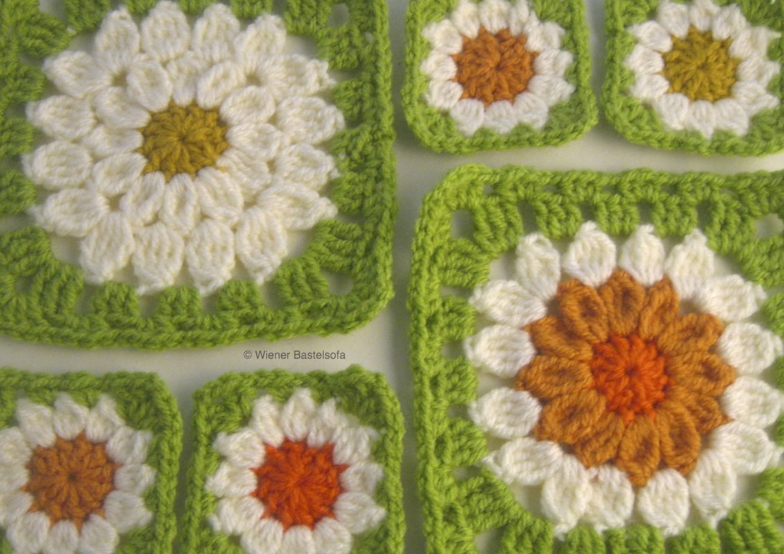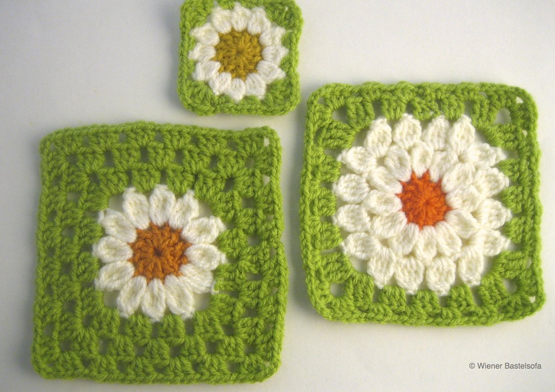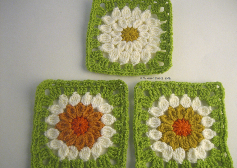 Die beiden großen Squares sind 12 x 12 cm, das klein Square ist 6 x 6 cm groß und sind mit Häkelnadel Nr. 4 aus Schachenmayr Bravo (50 g/ 133 m) gemacht.