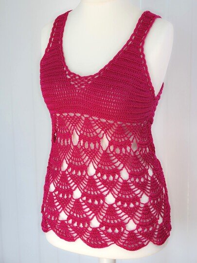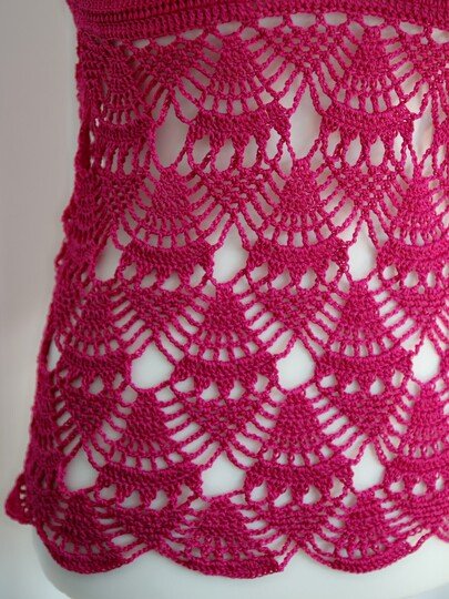 Größen: 34-46, an Brust, Trägern, Rücken und Bauch, sowie in der Länge noch individuell anpassbar. Die Anleitung enthät eine Häkelschrift.