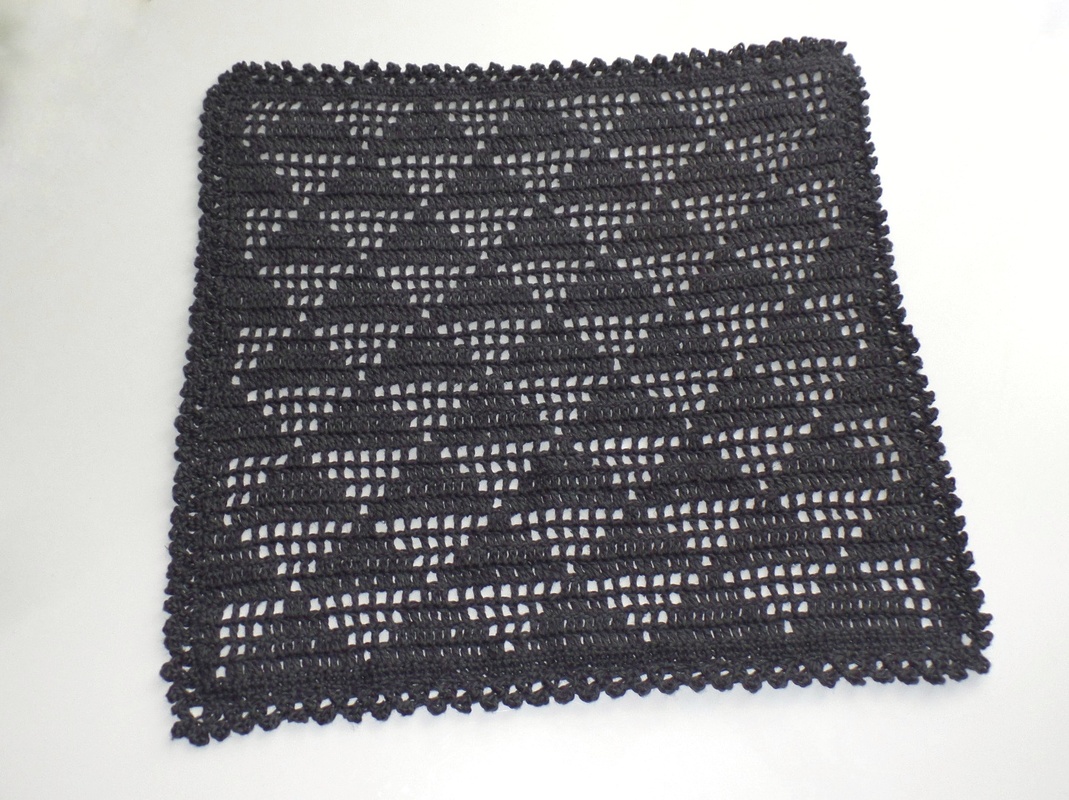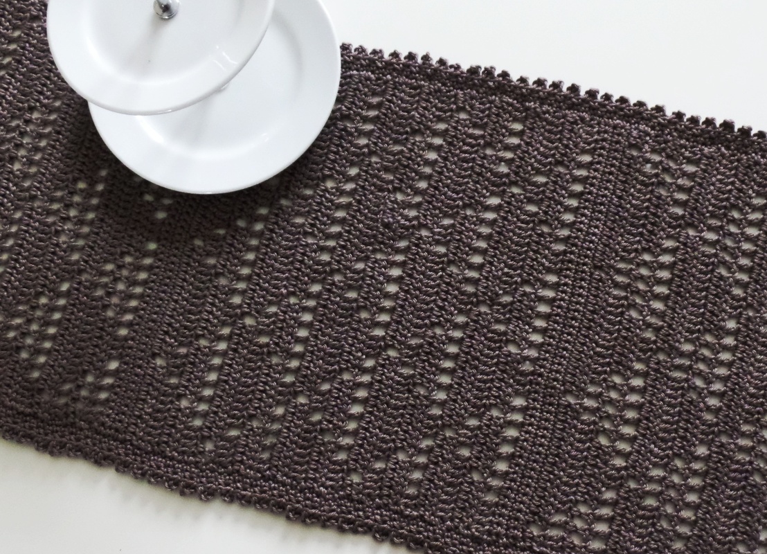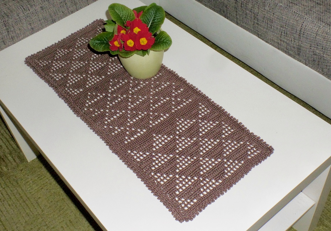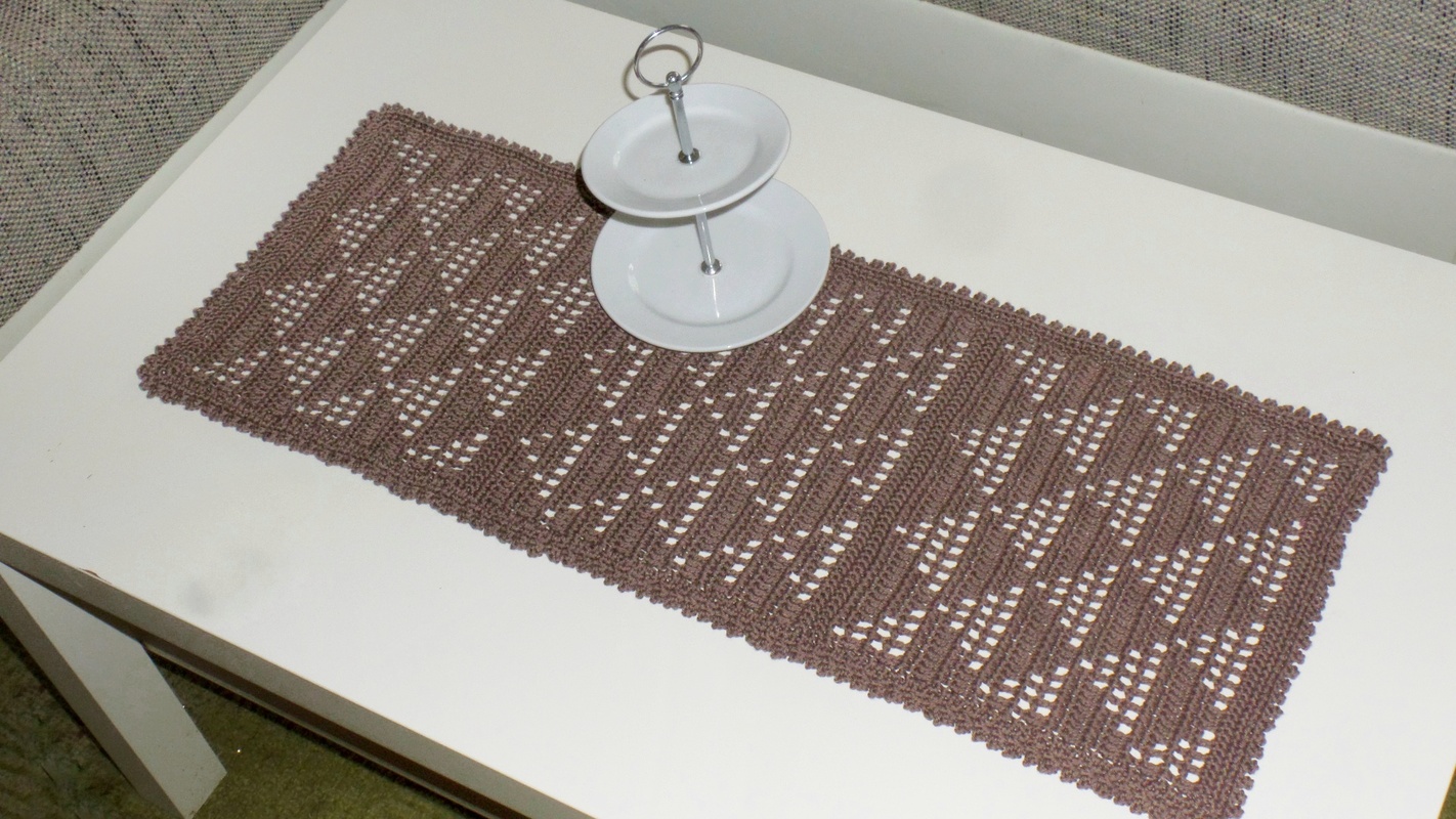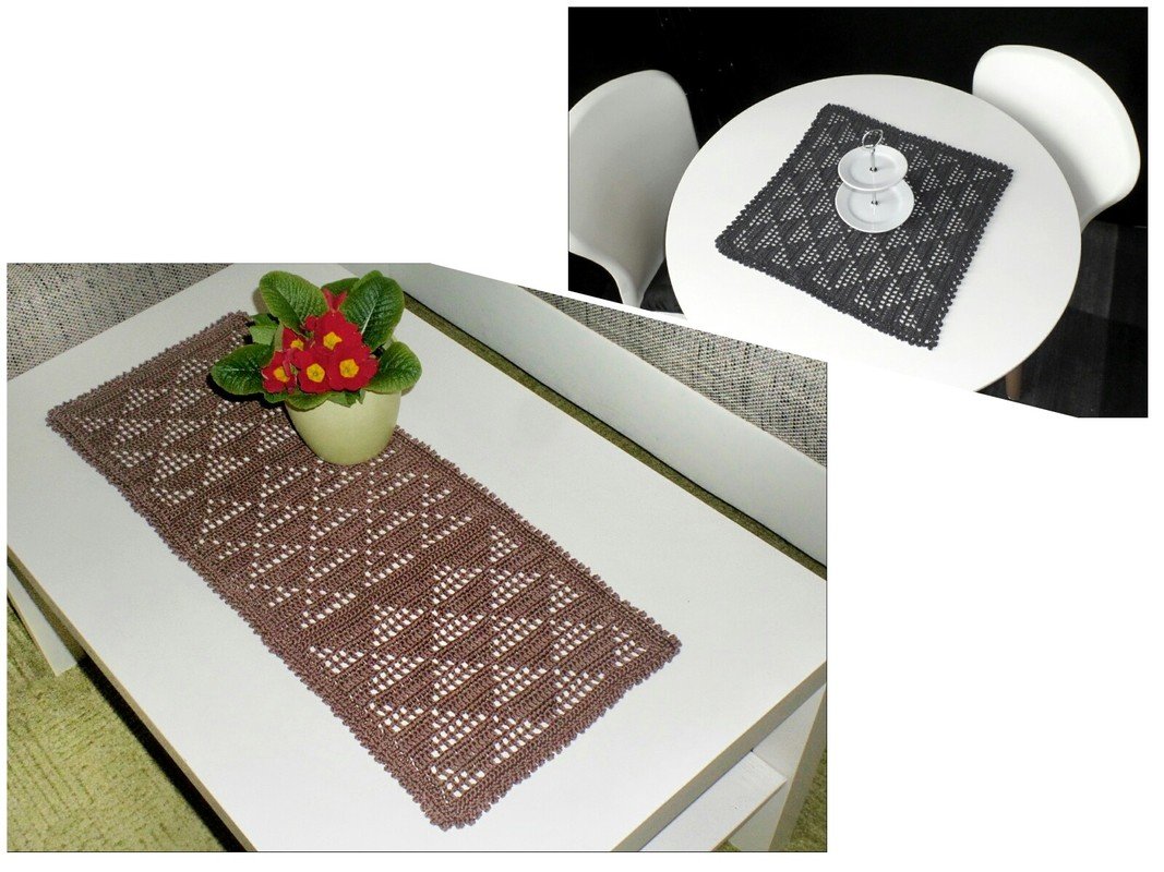einen Tischläufer und eine quadratische Mitteldecke. Das Filetmuster sind löchrige und gefüllte Dreiecke für die Freunde der grafischen, klaren und schnörkellosen Muster.