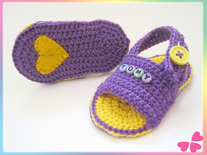 Mit Buchstabenperlen für den eigenen Namen und einem Herzchen aus Filz auf der Schuhsohle, lassen sich diese Häkelsandalen besonders individuell und hübsch gestalten.