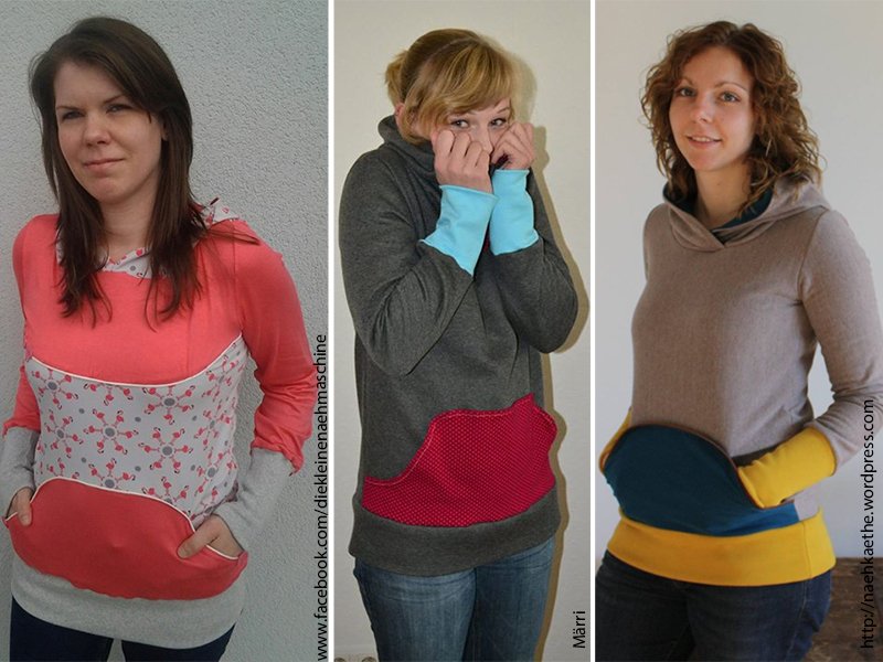 Du kannst den Pullover mit kontrastreich gefütterter Kapuze nähen oder ganz ohne Kapuze mit schönem Rundhalsausschnitt. Das geteilte Vorderteil bildet einen tollen Blickfang. Natürlich wird auch die Version ohne Teilung ausführlich erklärt!
