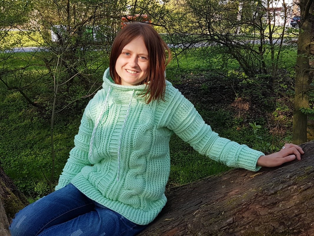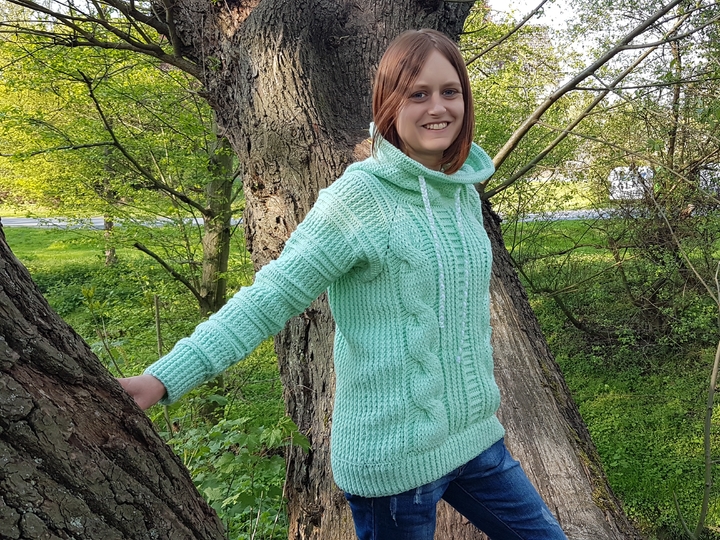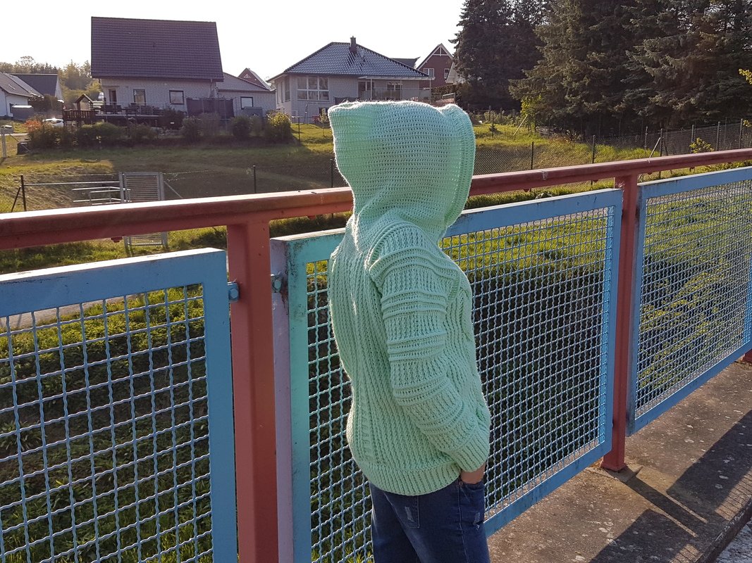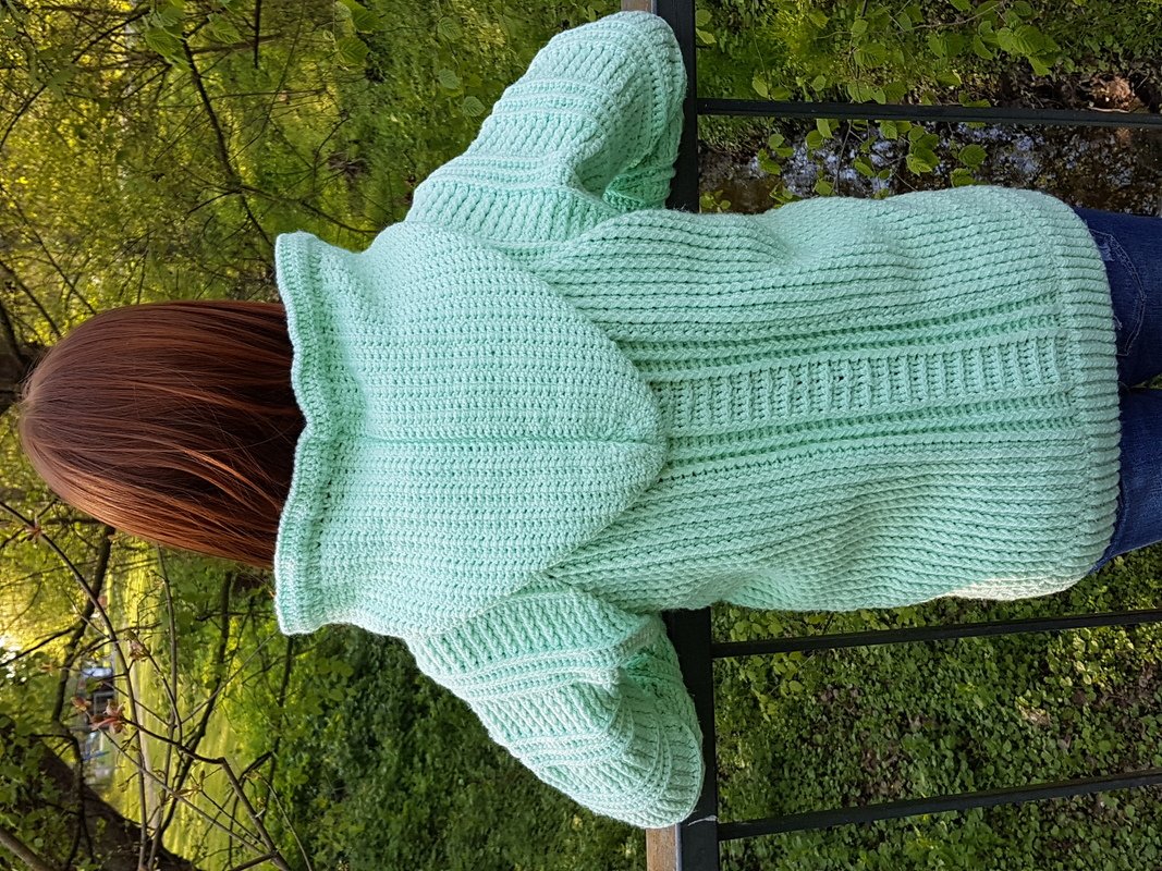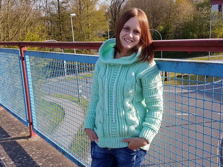Der Pulli fällt in jeder Größe etwas oversize aus und ist daher besonders bequem. Der hohe Kragen und die Kapuze geben dem Pulli einen lässigen Look. Obwohl der Pulli mit einem dünnen Garn gehäkelt wird, fällt er hinterher dick und Voluminös aus.