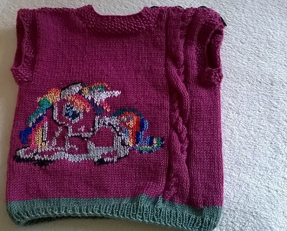 Der fertige Pullunder wiegt ca.150 g, gesamt mit Einstickmuster 180 g