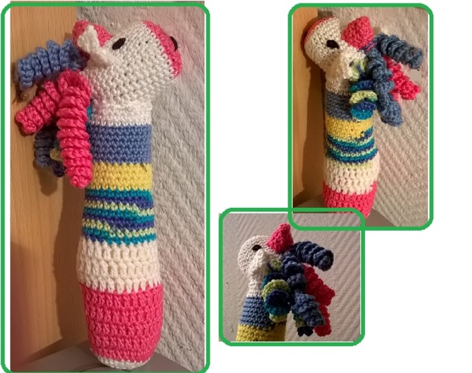 Meine erste Idee Kreolen aufzunähen habe ich wieder verworfen. Meine Enkelin „zippelt“ zu gerne daran herum. Also habe ich die Mähne mit Maschenstich gefertigt. Die Beschreibung für Kreolen ist in der Gratisanleitung für die Rassel beschrieben