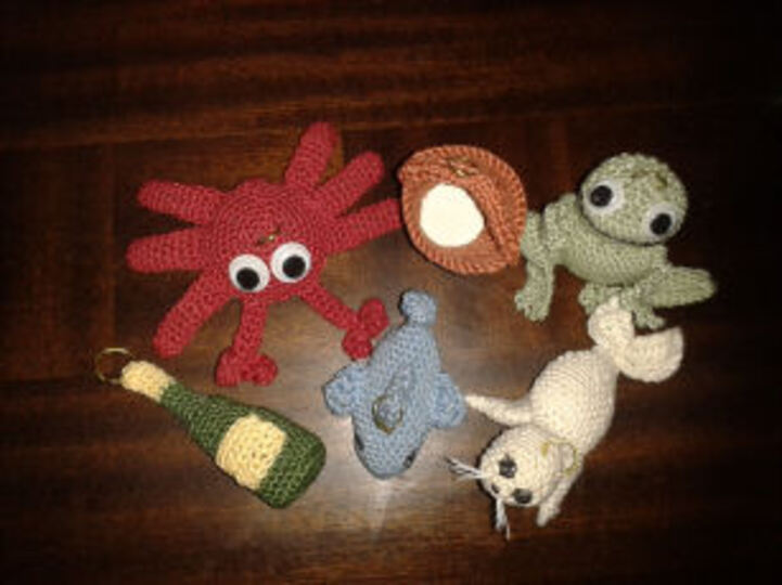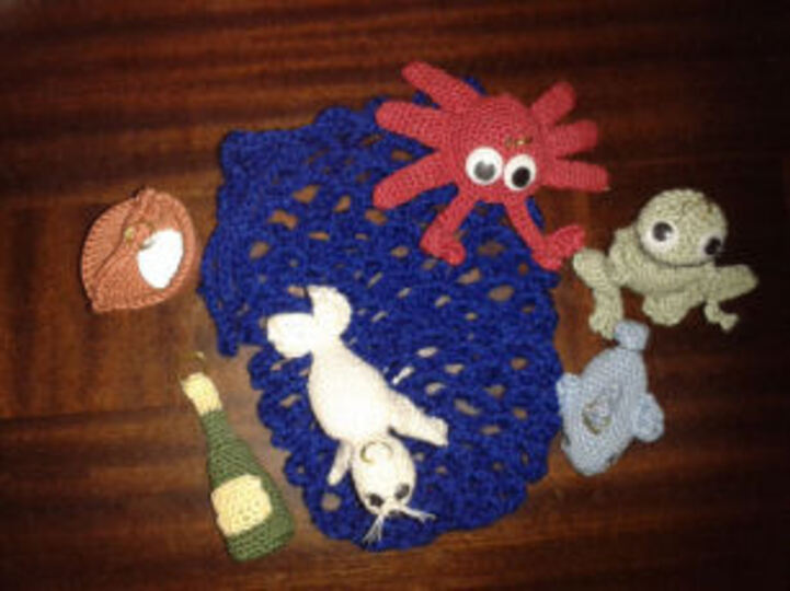 Die Robbe, der Hai, die Flasche, der Frosch, die Krabbe und der Eimer sind mit verschluckbaren Kleinteilen (Wackelaugen und Metallringe) versehen, daher für Kleinkinder ungeeignet!