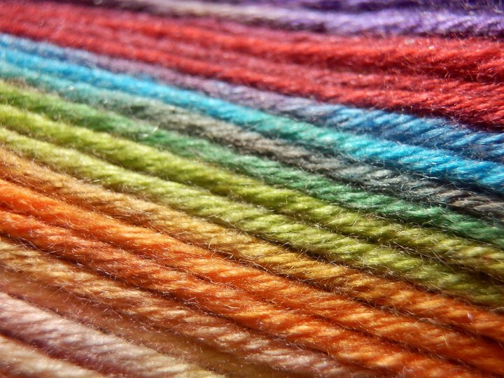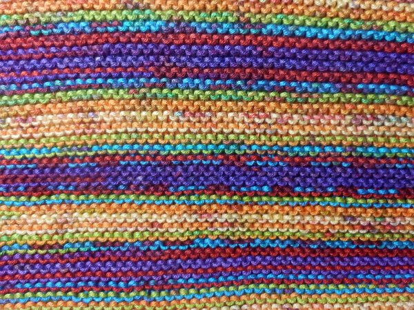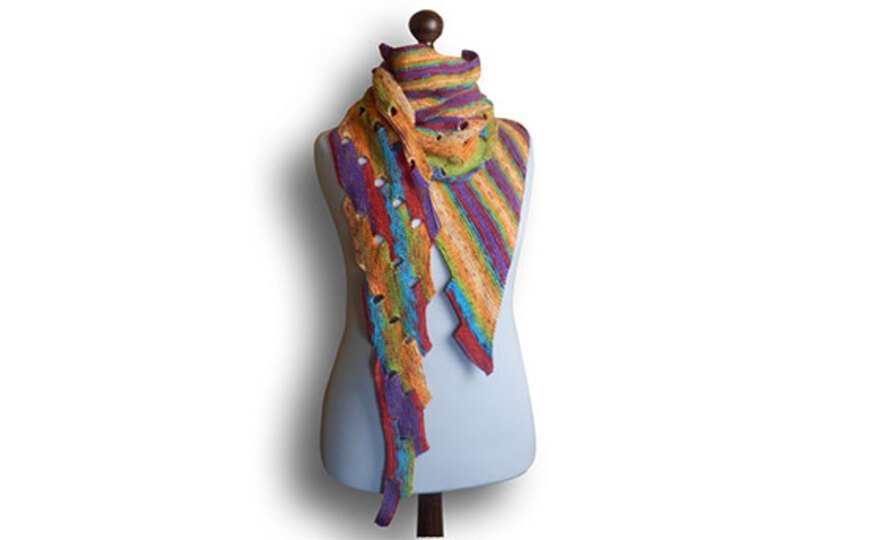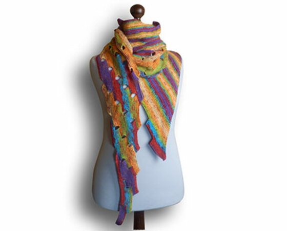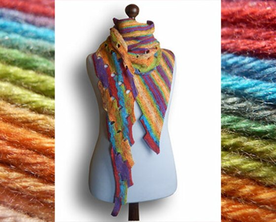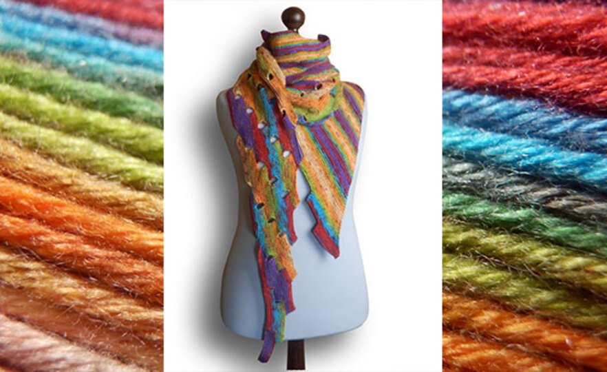 Am besten ist eine bunte Wolle mit einem längeren Verlauf geeignet, aber auch kunterbunte Reste oder zwei und mehr Farben abwechselnd sehen mit diesem Tuch toll aus.