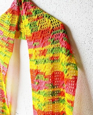 Der abgebildete Schal wurde aus Lana Grossa Meilenweit Neon gehäkelt, ein 4-fädiges Garn in Neonfarben, das leider kaum mehr erhältlich ist. Jede farbenfrohe Sockenwolle kann man verwenden. Natürlich kann man den Schal auch in einer dezenteren Farbe häkeln.