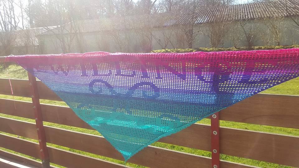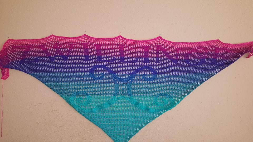 ca. 213 cm lang (linke zur rechte Ecke) und ca. 74 cm breit (Mitte bis zur Spitze) – die Größe ist aber abhängig von der Nadelstärke, der Festigkeit der einzelnen Maschen und dem verwendeten Garn.