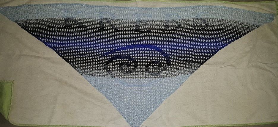 ca. 194 cm lang (linke zur rechte Ecke) und ca. 73 cm breit (Mitte bis zur Spitze) – die Größe ist aber abhängig von der Nadelstärke, der Festigkeit der einzelnen Maschen und dem verwendeten Garn.