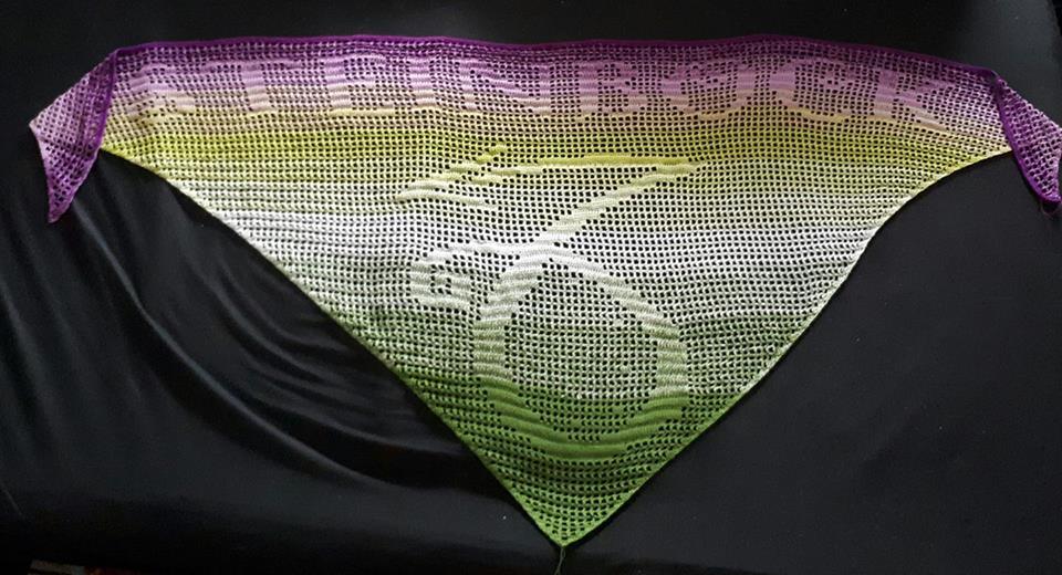 Das Tuch wurde mit Nadelstärke 2,5 und einem Bobble mit ca. 850 Meter LL und 3 fädrig gehäkelt. Es ist