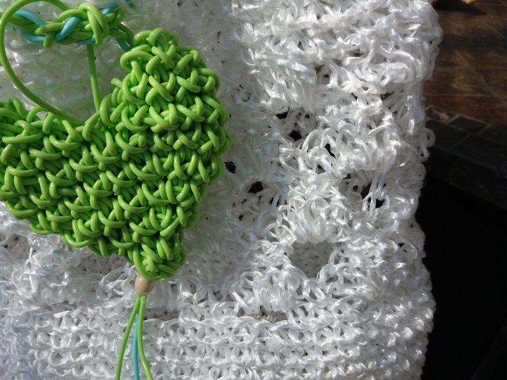 Verwendet wurde ein Bindegarn aus Polypropylen (ca. 2mm breit) eine 10er Häkelnadel, Wäscheleine, Tesa, Holzperlen , Klebepistole und ein Herz aus Wäscheleine. Ich habe gesehen damit man diese Band auch im Internet findet.