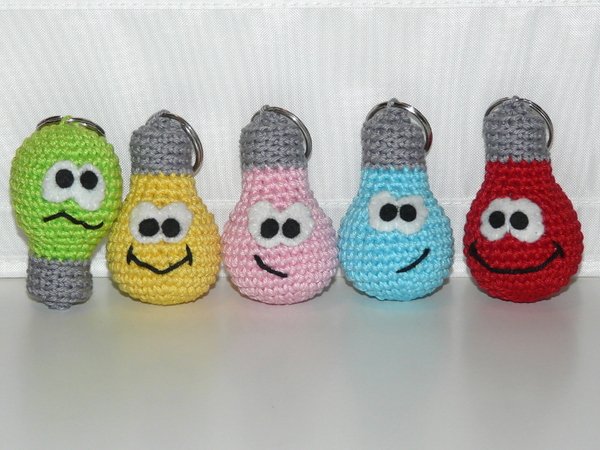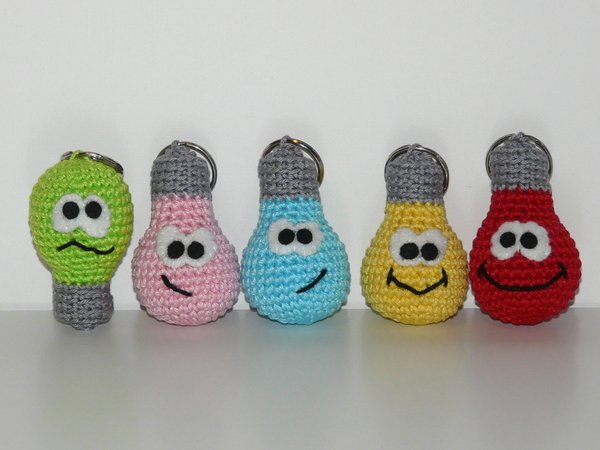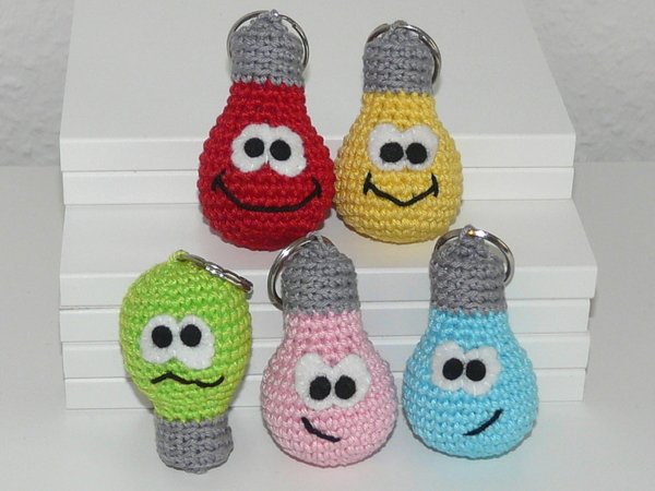 Auf der Suche nach eine neuen Idee für einen kleinen Schlüsselanhänger oder Taschenbaumler kam mir die Erleuchtung :) Und hier sind sie, die lustigen kleinen Glühbirnen. Sie leuchten in den buntesten Farben und sind ein Hingucker an jedem Schlüsselbund oder an jeder Tasche. Die kleinen Glühbirnen sind z.B. ein schönes Geschenk zur Prüfung jeglicher Art. Ob zum Schulabschluss, zum Abitur oder zur Abschlussprüfung der Ausbildung, die Glühbirnen behalten immer die Fassung.