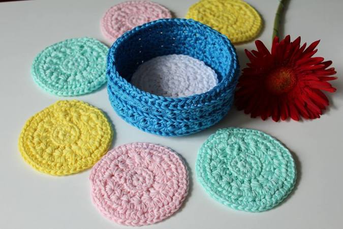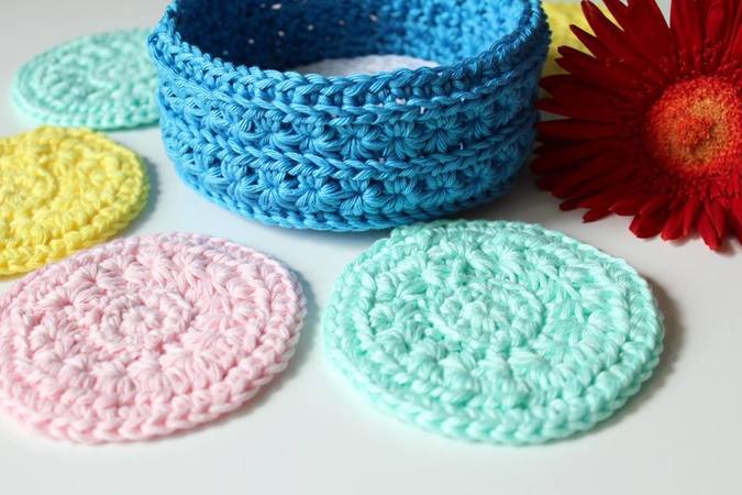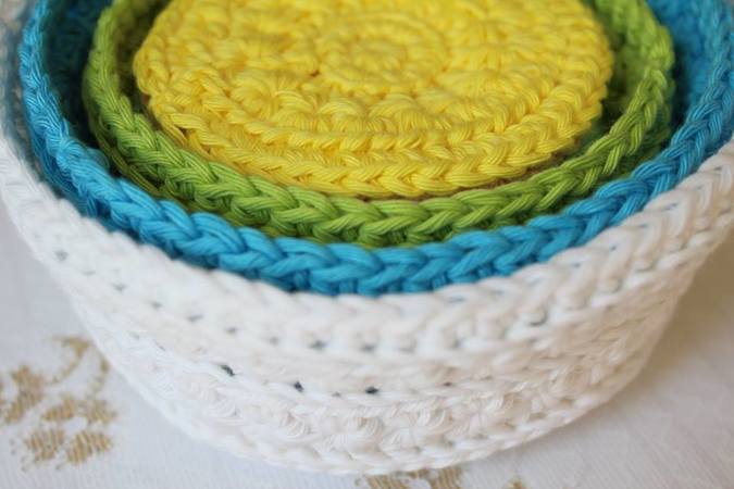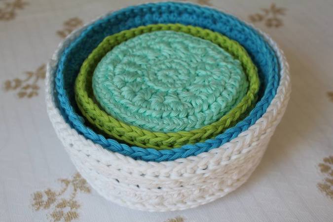 Gehäkeltes Körbchen „eine runde Sache“ zur Aufbewahrung der gleichnamigen Untersetzer, die Sie als Anleitung auch in meinem Shop finden können.