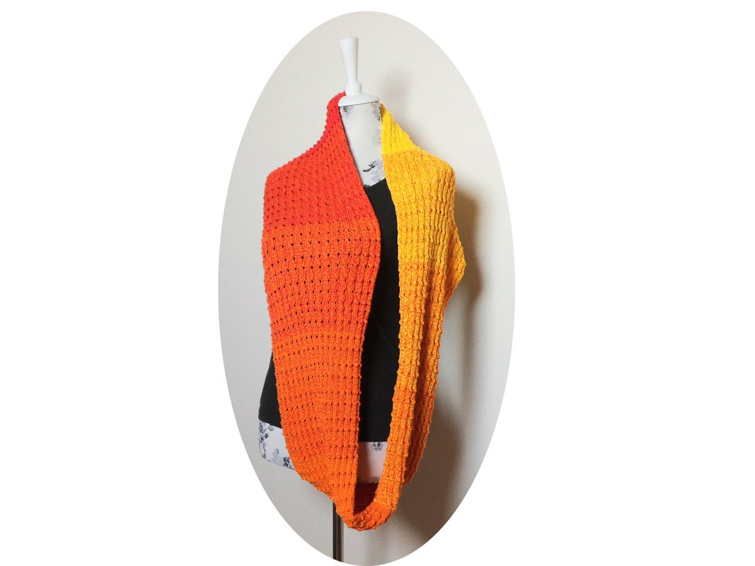 Der Loop hat eine Gesamtlänge von ca. 160cm (80cm pro Seite) und eine Breite von ca. 25cm und kann auch als Schal gestrickt werden.