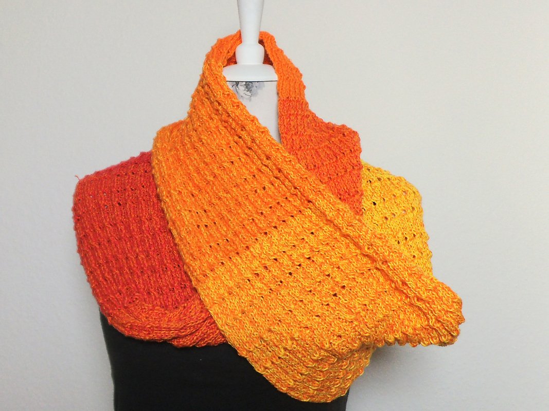 Mit 1 Bobbel kannst du nun diesen Loop "Feuersonne" stricken (natürlich auch für andere Garne geeignet). Ich habe hierfür einen 4-fädrigen Bobbel (ca. 800m) verwendet (Original: Regenbogen Tutti-Frutti von Rellana) und eine Rundstricknadel 4,0mm, sowie einen Reihenzähler.