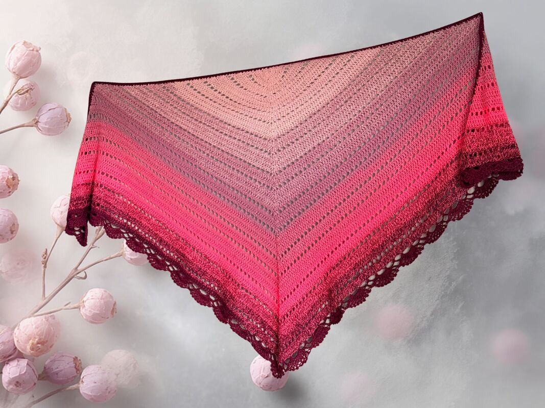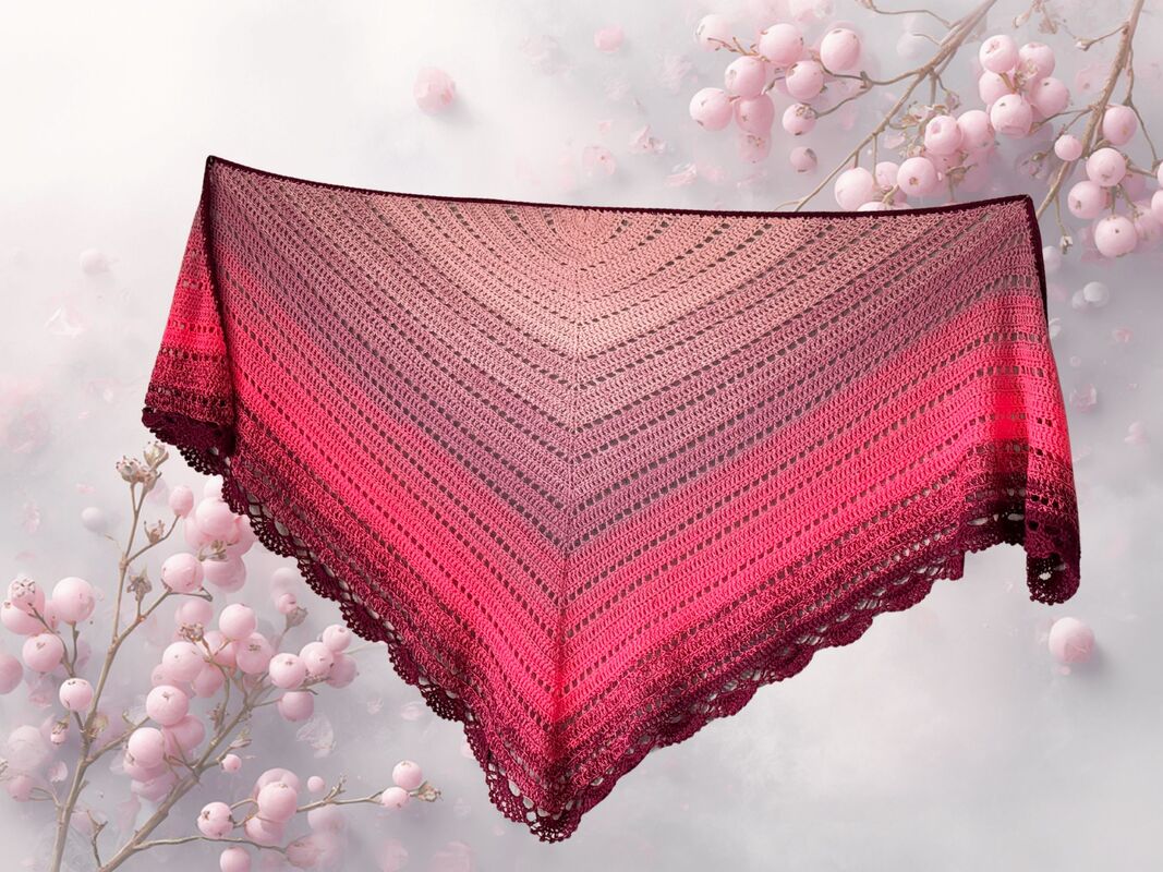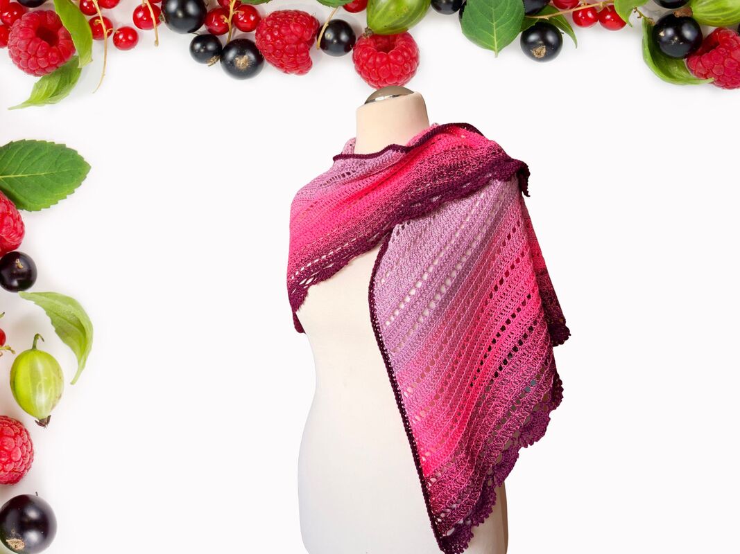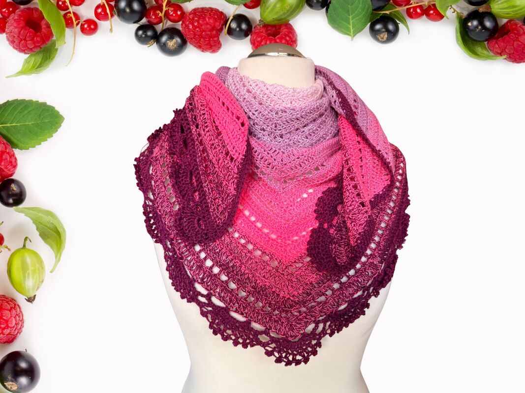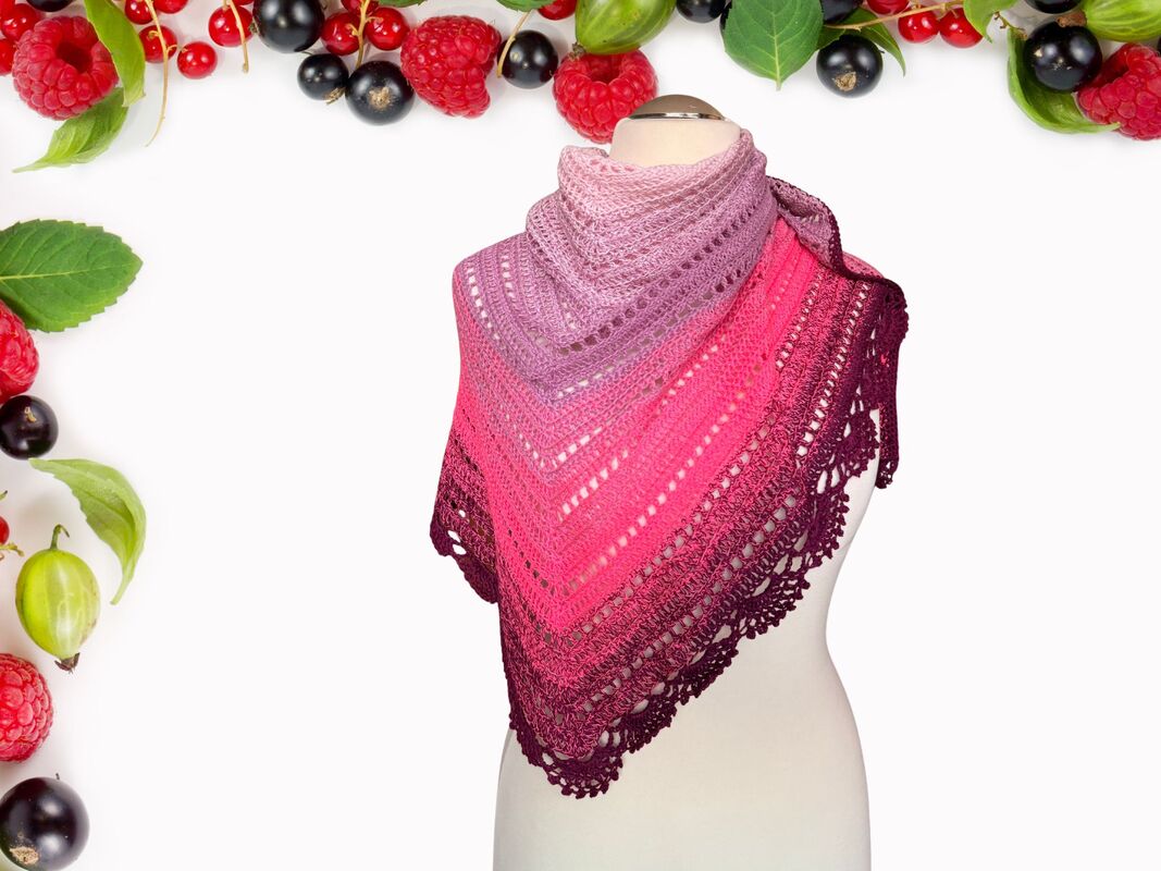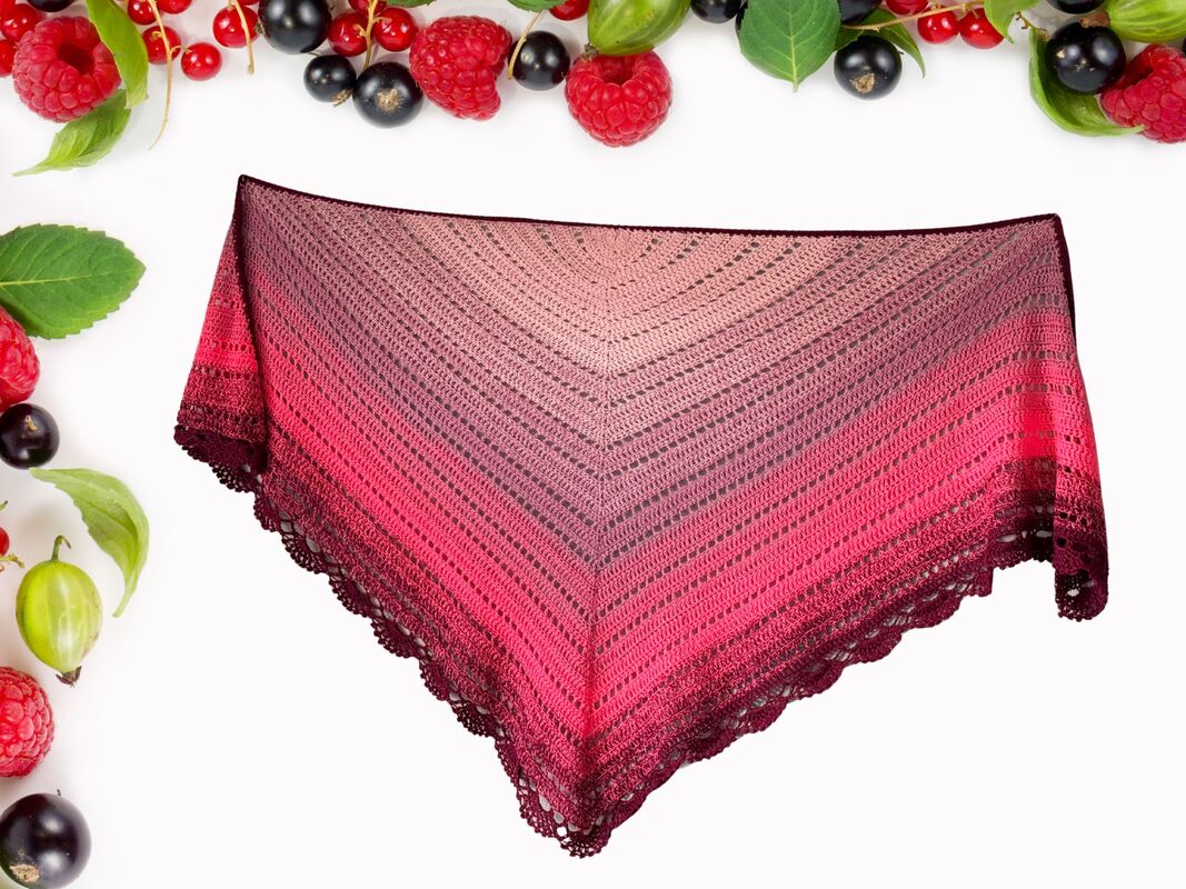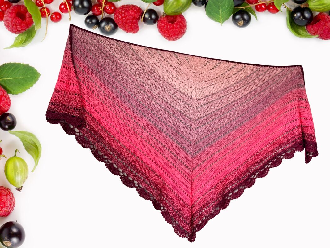 Das Dreieckstuch Wild Berries wird von der Mitte der langen oberen Kante aus gehäkelt. Durch regelmäßige Zunahmen in jeder Hinreihe entsteht die typische Dreiecksform.