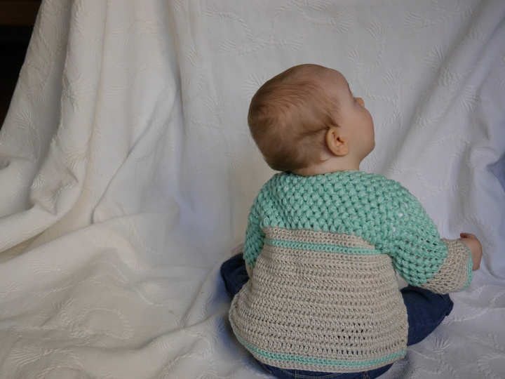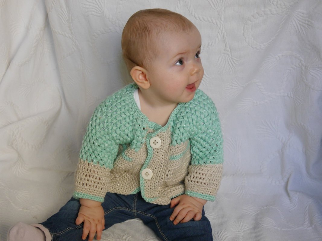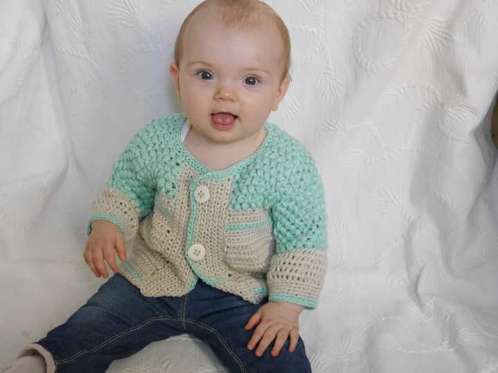 Dieses Kinderjäckchen hat einen schicken silbernen Beilauffaden im Garn und macht mit dieser Farbkombination auch bei den Kleinen richtig Lust auf Frühling.