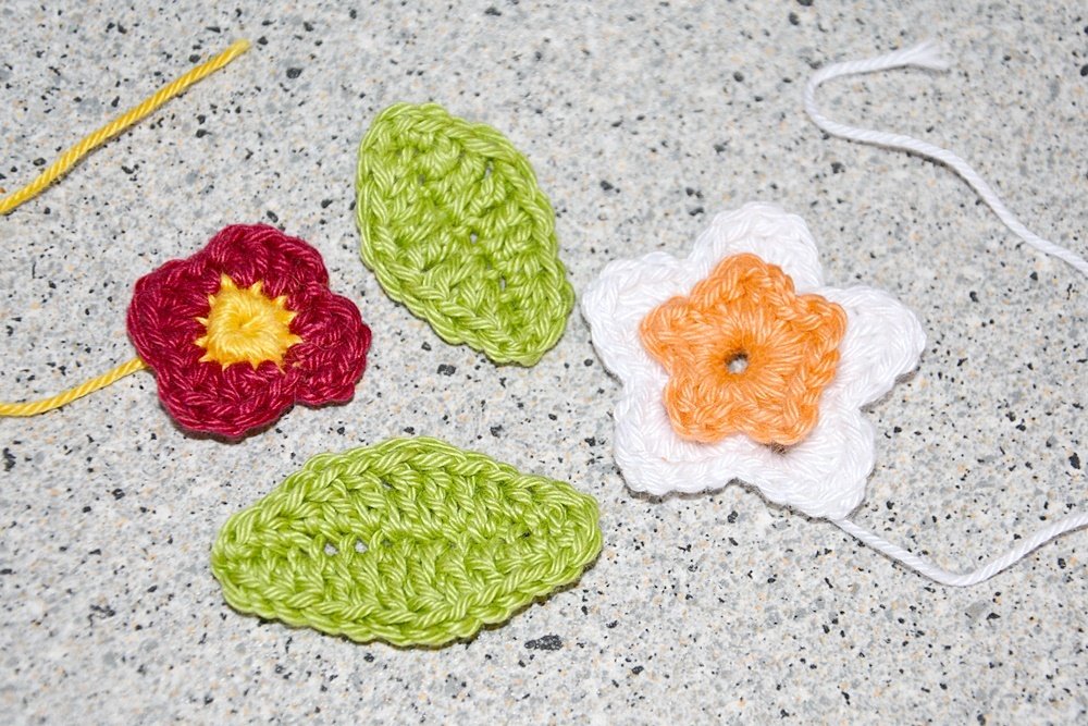 Ausserdem zeige ich in der Anleitung mit Fotos, wie man zwei verschiedene Häkelblumen mit Blatt machen kann.