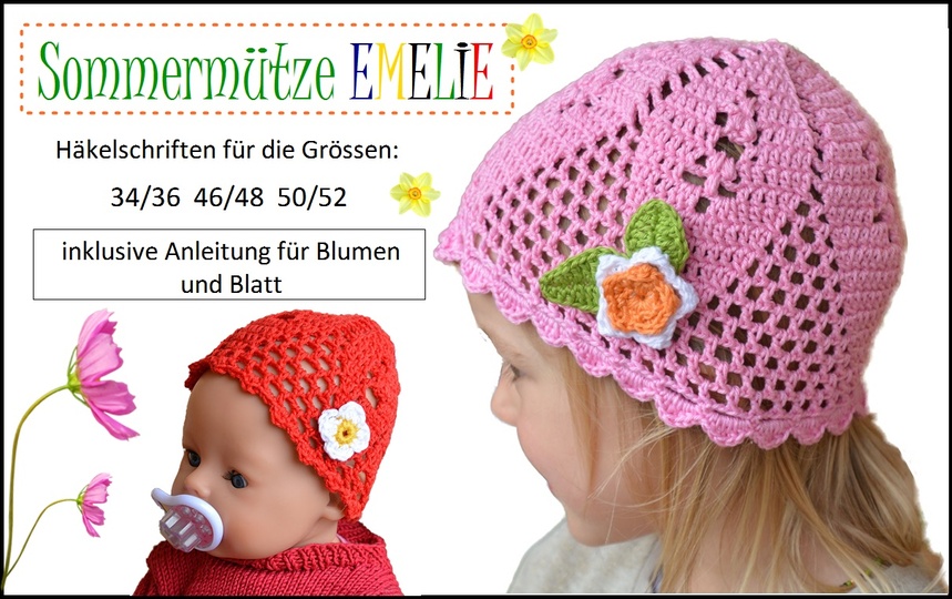 Die Sommermütze Emelie für die Grössen 34/36, 46/48 und 50/52 ist luftig leicht und chic zugleich. Für Kinder ab ca. 2 Jahren und die kleinste Grösse ist für Puppen geeignet. So kann Mama gleich für die Puppe dasselbe Mützchen häkeln und Prinzessin ist glücklich.