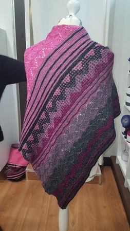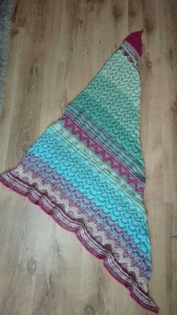 Das Tuch erhält bei einem Bobbel mit 900 metern Lauflänge und Stricknadeln mit 3,5 mm eine Größe von ca. 1,75 x 0,7 metern.