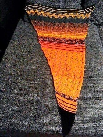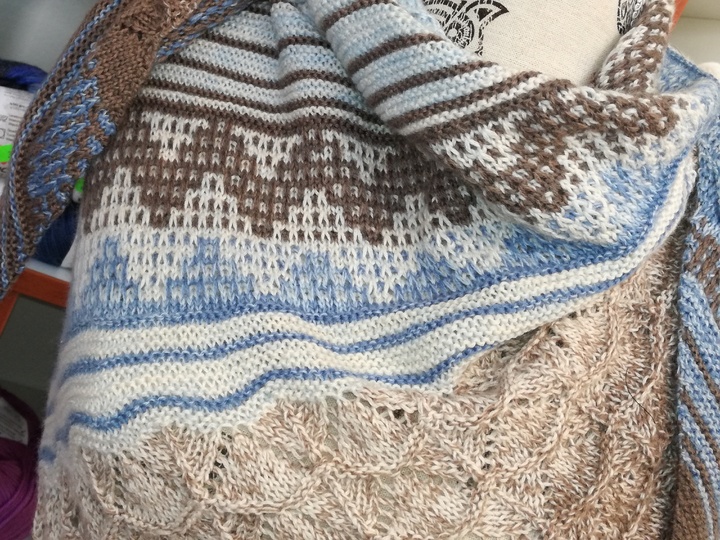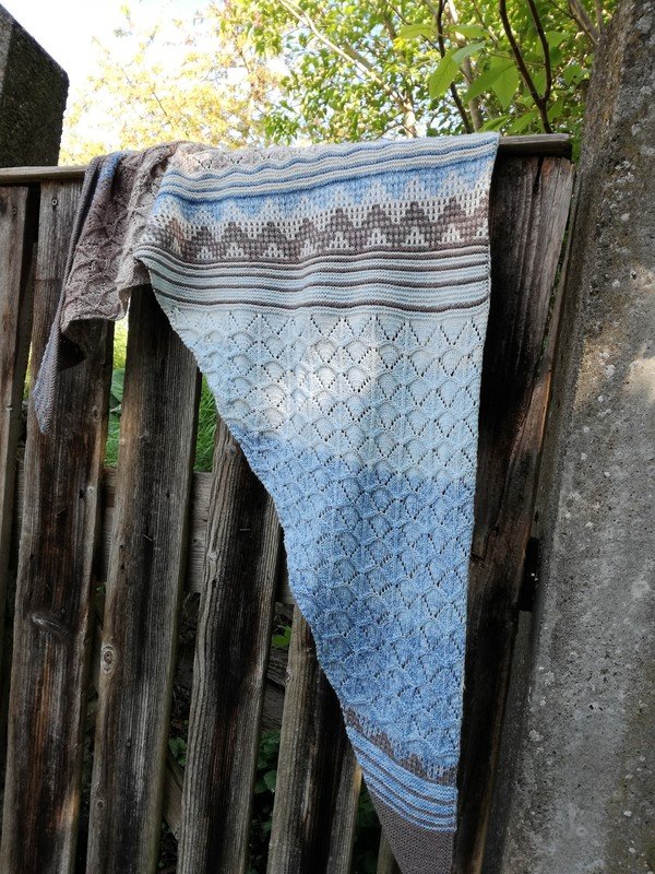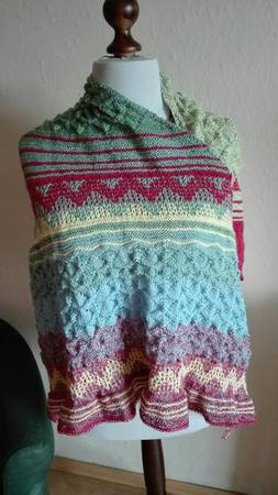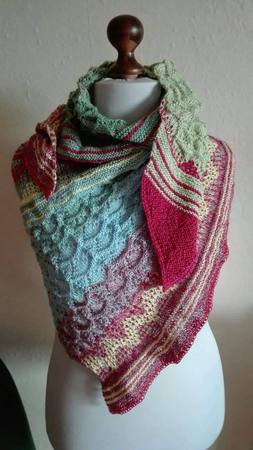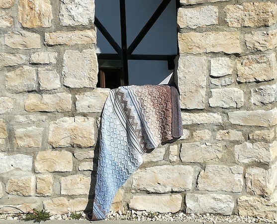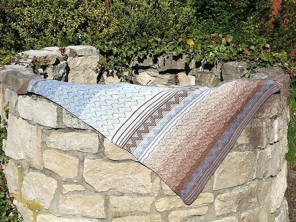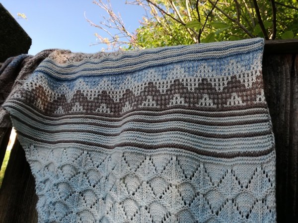 Es wurde gestrickt aus dem Farbverlaufsgarn Himmel und Erde aus Merino von Wollbonbon. Durch die verschiedenartigen Muster ist es spannend und kurzweilig beim Stricken.