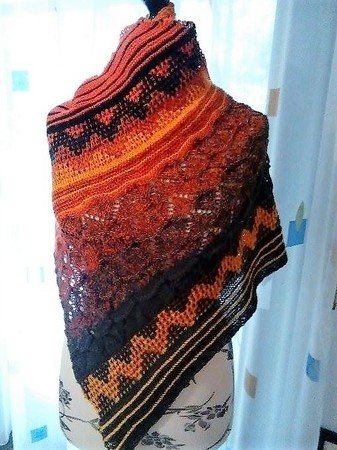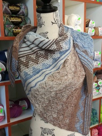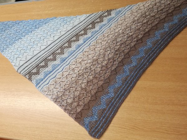 Himmel und Erde ist ein leicht asymmetrisches Dreieckstuch, das durch seine verschieden Muster und harmonische Farbgebung ein toller Blickfang ist.