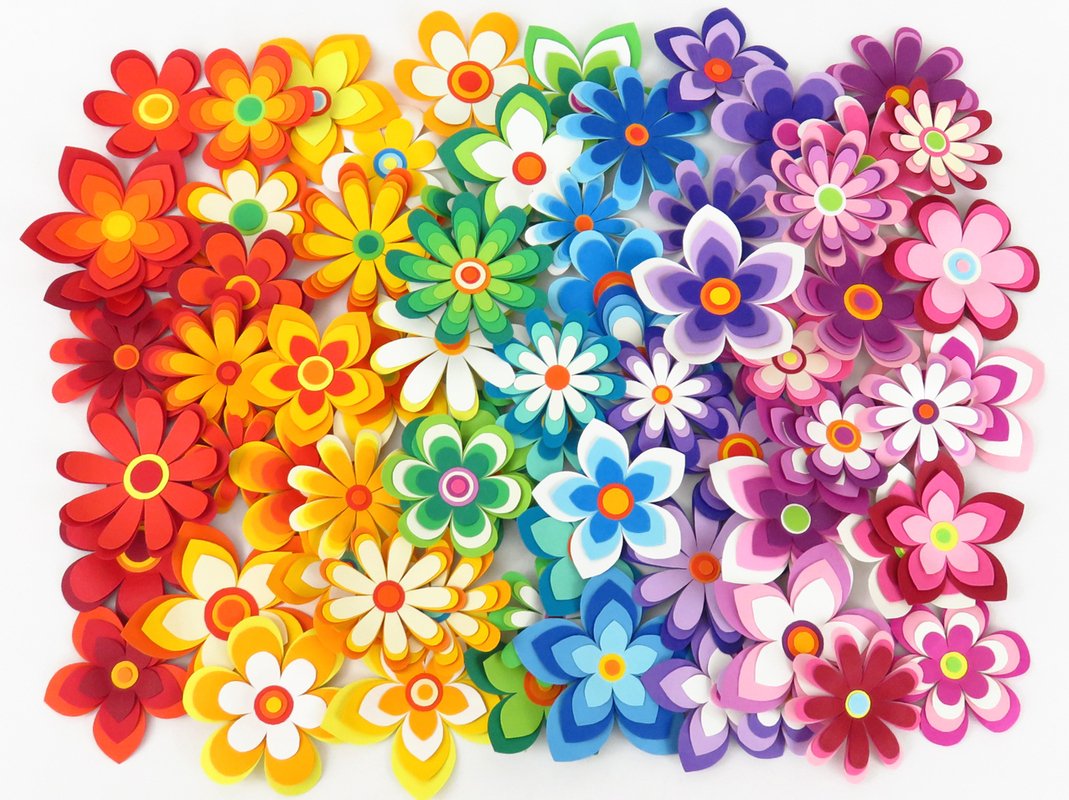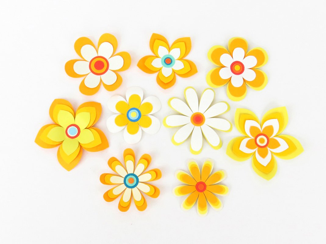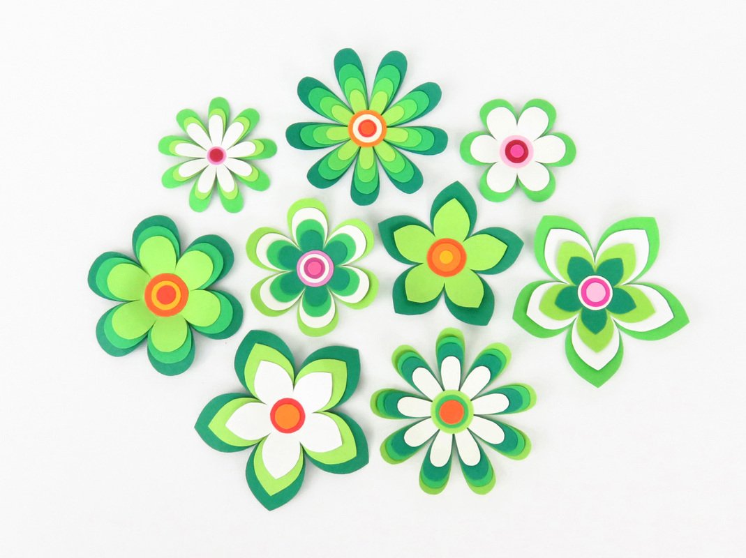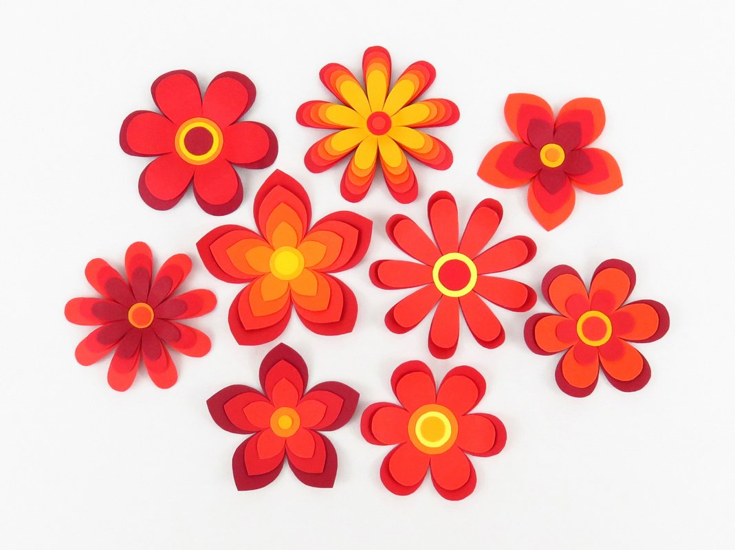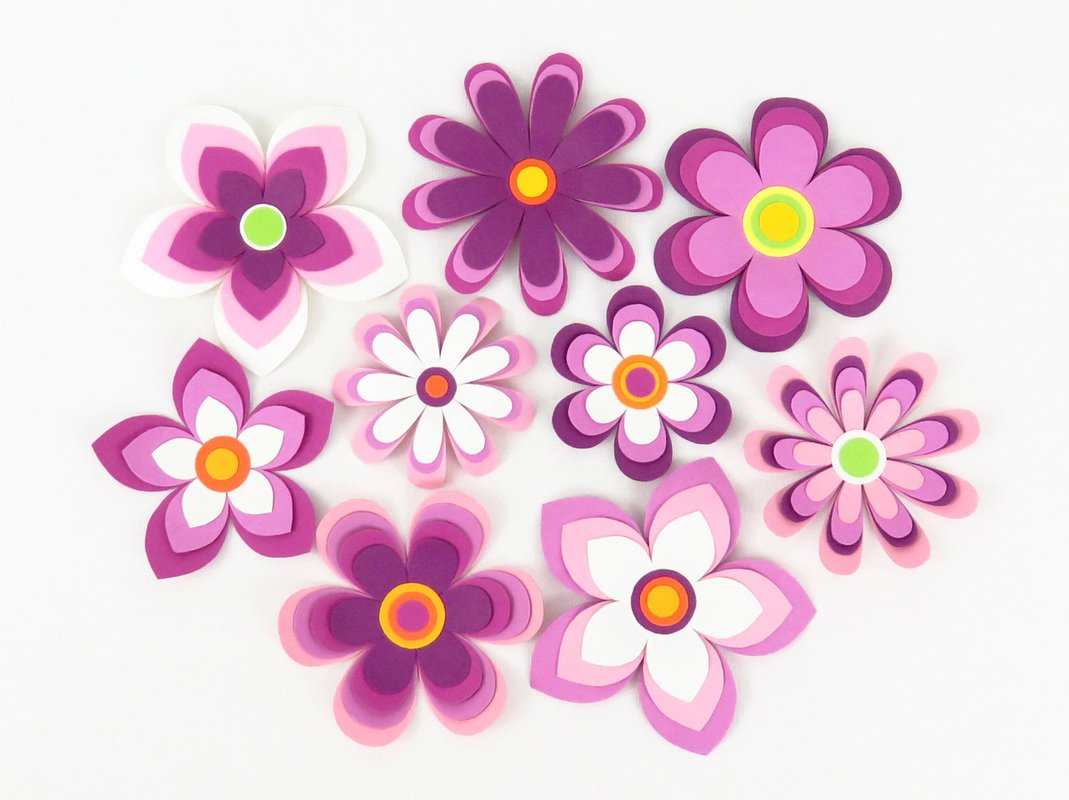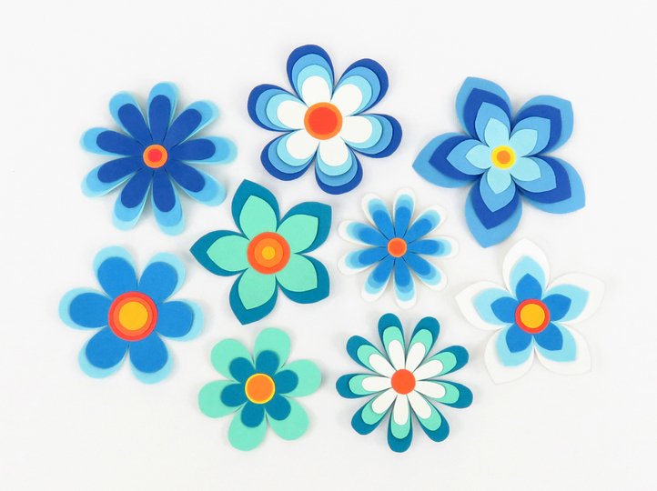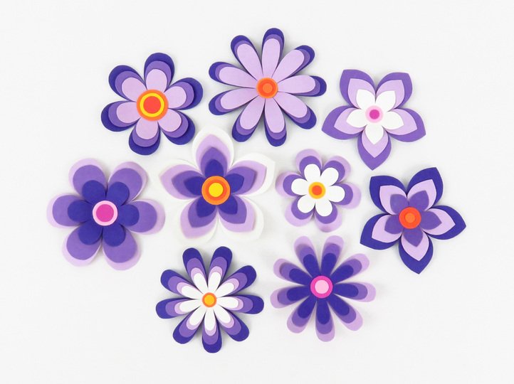 Durch das Übereinanderkleben von Blumenformen in verschiedenen Größen und Farben kannst du gefüllte und ungefüllte Blumen mit schönen Farbverläufen oder außergewöhnlichen Farbkombinationen basteln.