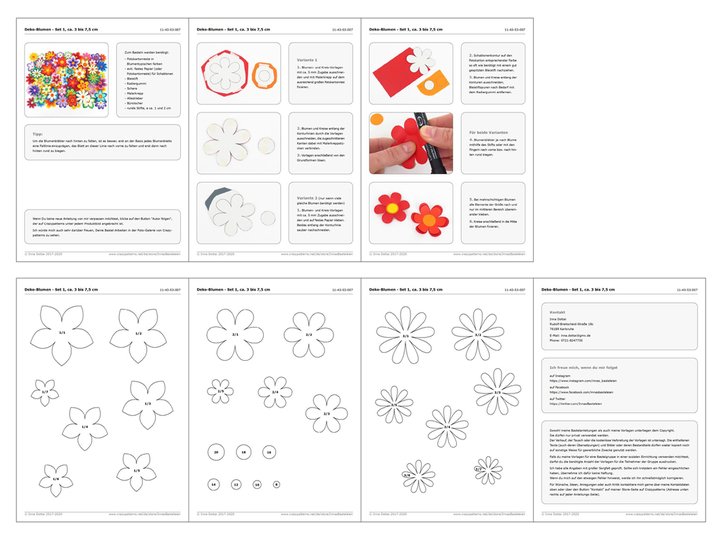 In der Anleitung erkläre ich an zwei einfachen Beispielen, wie diese Blumen gefertigt werden. Mit diesem Wissen und den Vorlagen kannst du alle abgebildeten Blumen nacharbeiten und unzählige eigene erfinden. Die Blumen sind sowohl für Anfänger als auch zum Basteln mit Kindern wunderbar geeignet.