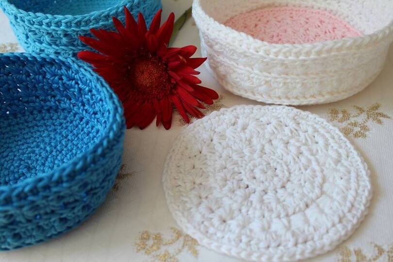 Gehäkeltes Körbchen „eine runde Sache“ zur Aufbewahrung der Untersetzer, können Sie auch als Anleitung in meinem Shop finden.