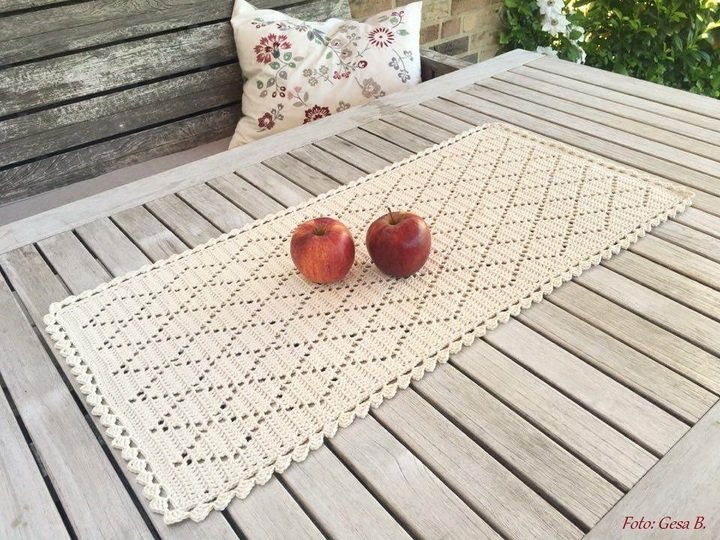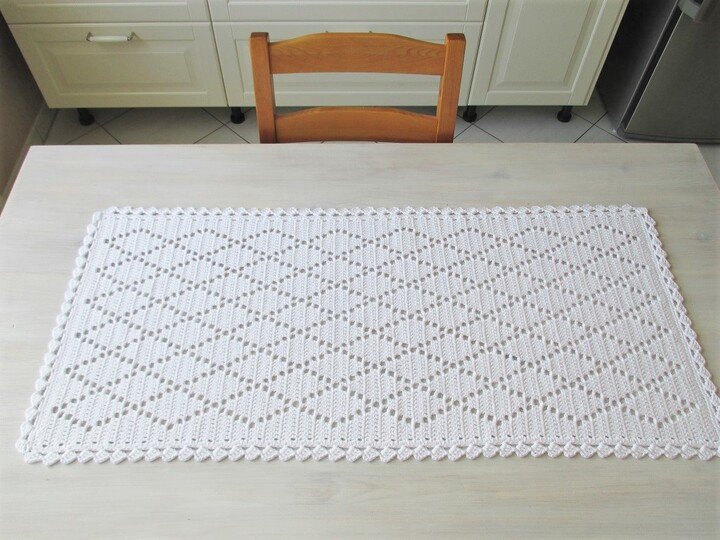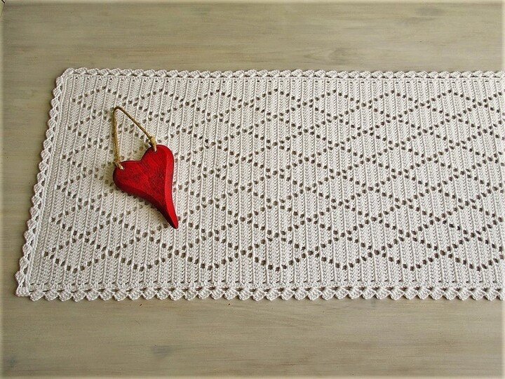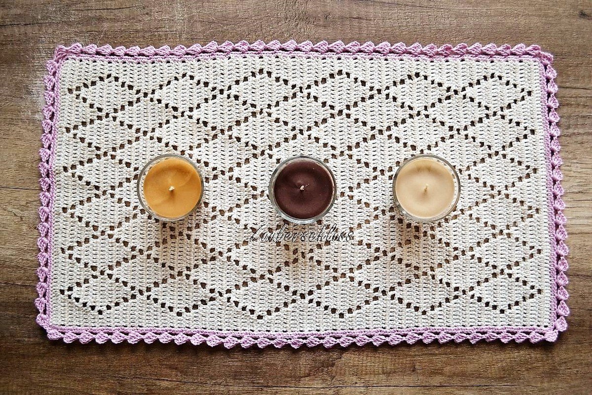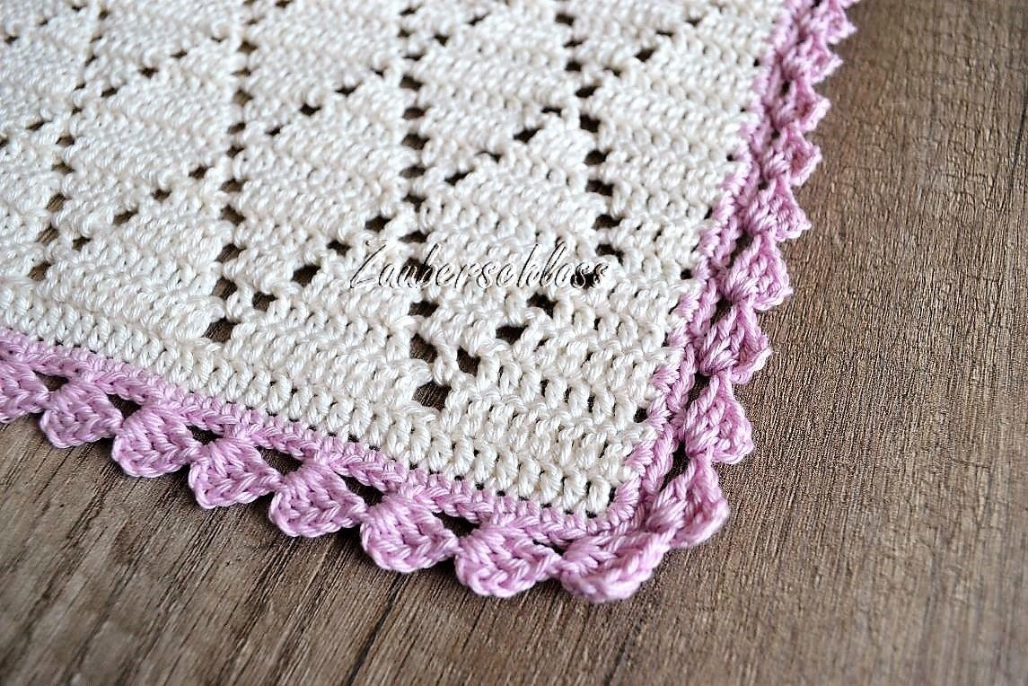 Das Muster läßt sich in Breite und Länge sehr leicht anpassen, so dass Du vom kleinen Platzset bis hin zur großen Tafel-Tischdecke alles häkeln kannst :-) Auch mit sehr dickem Textilgarn als Teppich gut geeignet!
