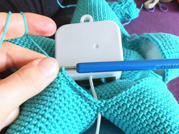 Benötigstes Material: G-B Wolle in türkis (2x; 100g) und gelb (1x; 50g), Rest in schwarz und rot, Häkelnadel 3,0mm, Füllwatte, Wollnadel, Schere, Spieluhr (in der Anleitung habe ich eine Bezugsquelle angegeben)