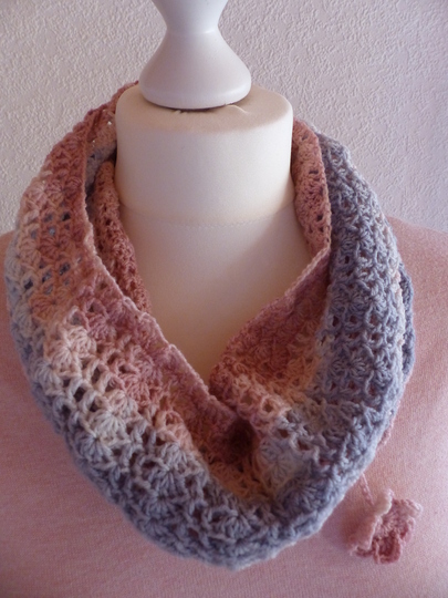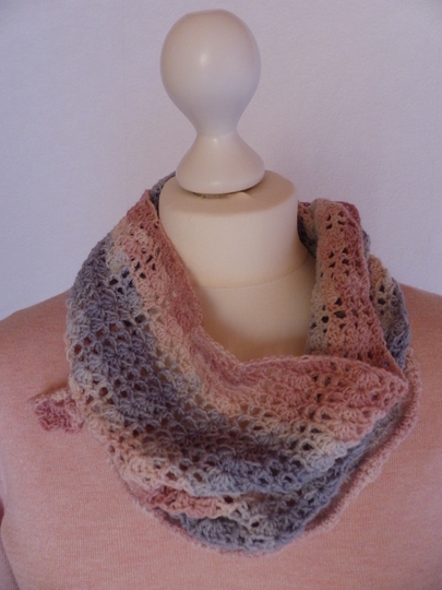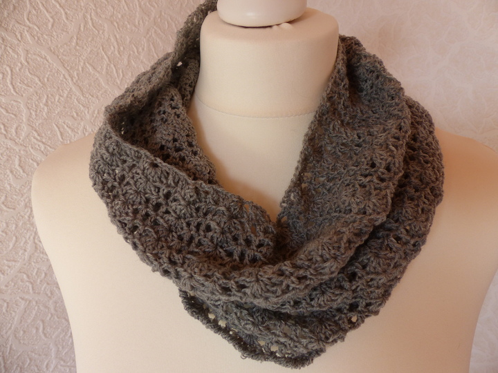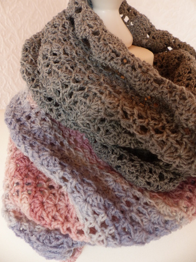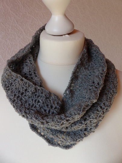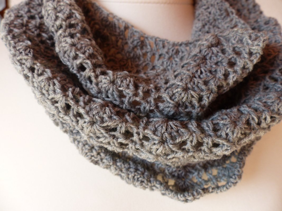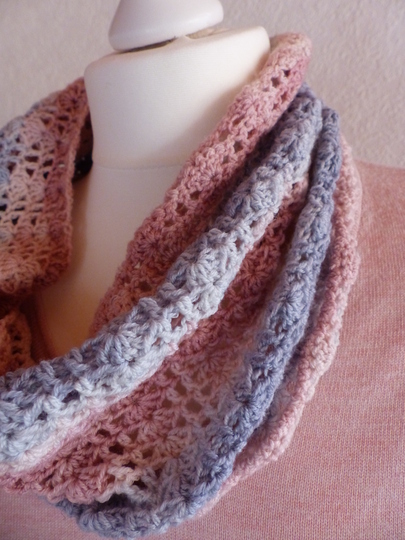 Häkelanleitung für einen Loop. Das Häkelmuster besteht nur aus einer Musterreihe, somit ein ideales Projekt für unterwegs. Es besteht aus Luftmaschen, Kettmaschen und Stäbchen. Für einen schönen Abschluß wird eine Reihe Krebsmaschen gehäkelt (diese Masche wird in der Anleitung auch gezeigt). Ein Wochenende auf dem Sofa genügt, um diesen schönen Loop zu häkeln....