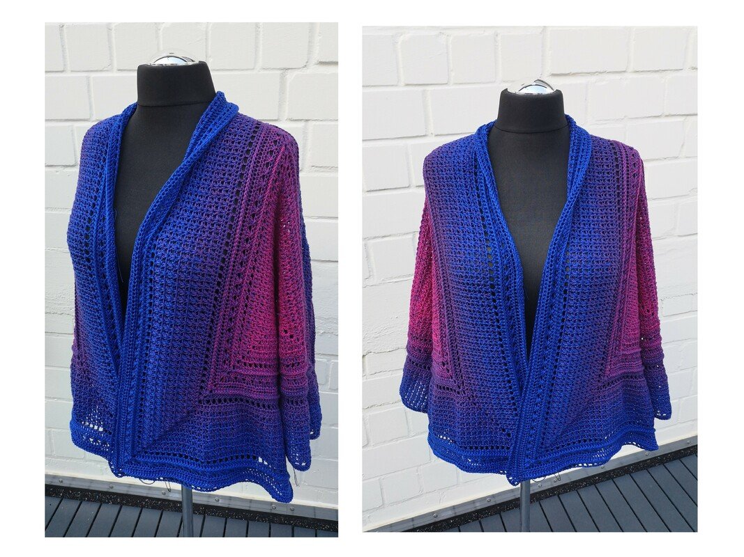 Solavia ist eine Hexagonjacke. Dies bedeutet, dass man die Jacke aus 2 Sechsecken formt. Da die Ärmel so ganz automatisch entstehen, benötigt man keine extra Ärmelbobbel.