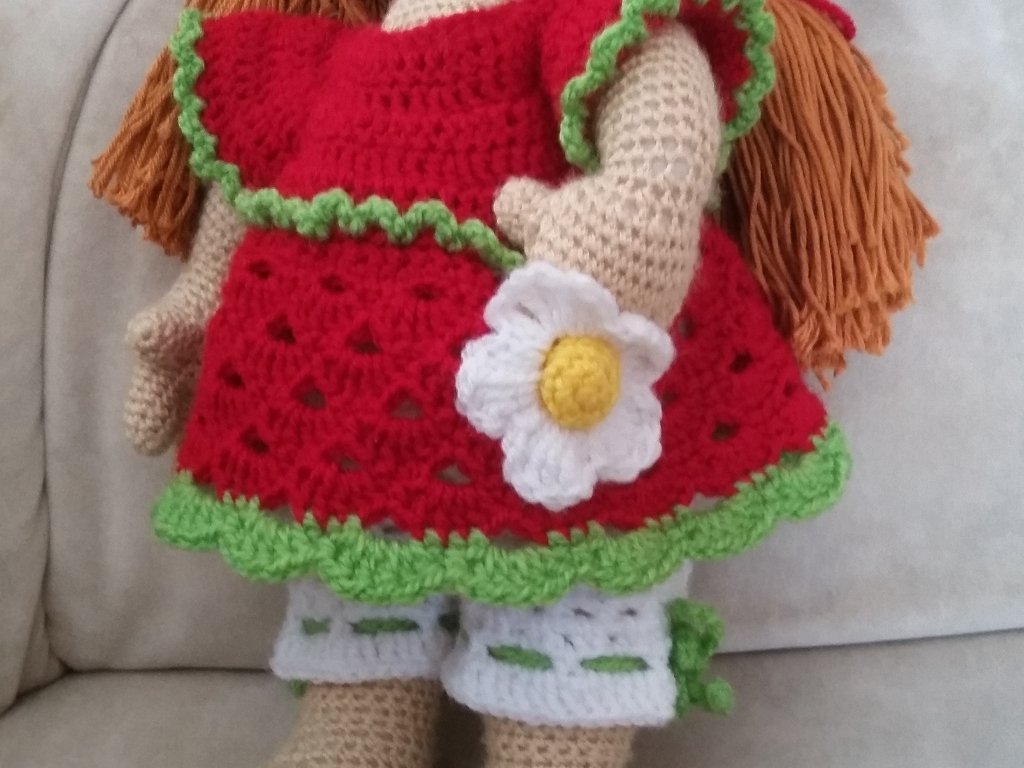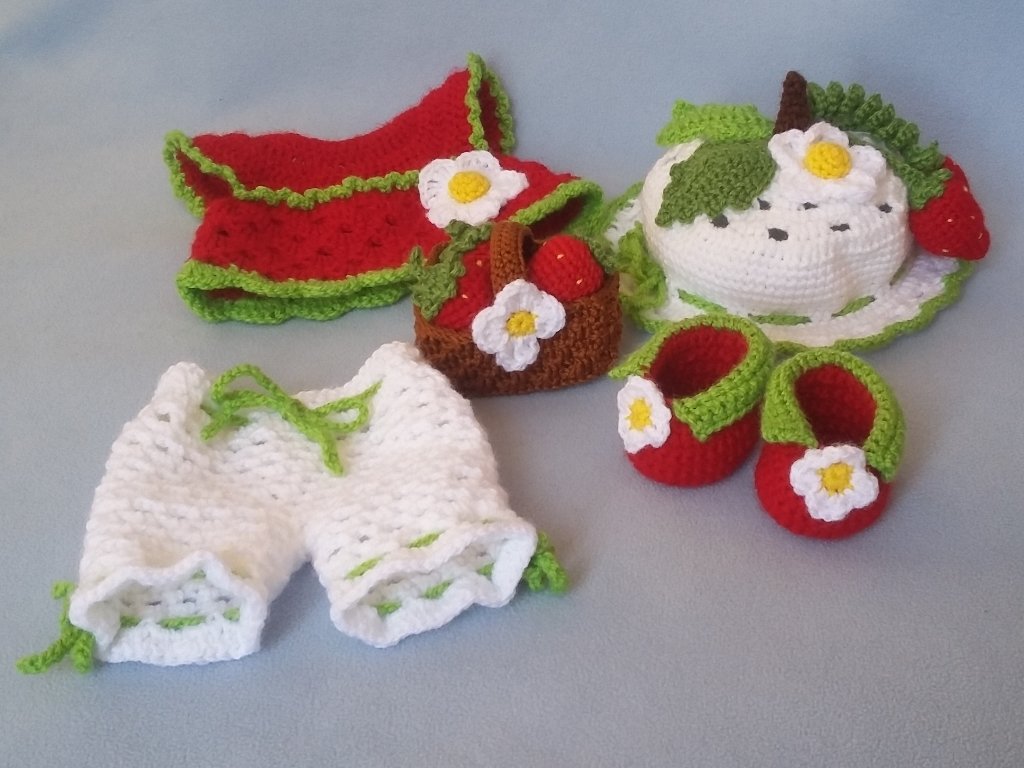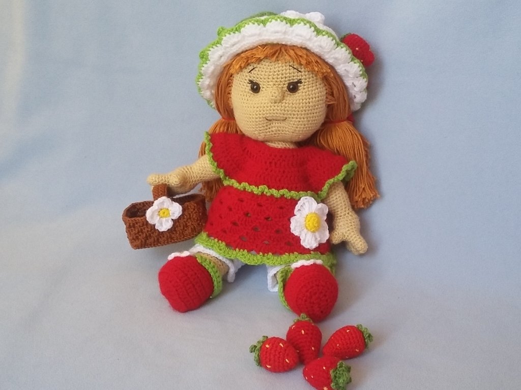 Die Kleidung passt Puppen von einer Größe von ca. 36 cm. Die PDF beinhaltet die Anleitung für das Kleid, die Schuhe, das Höschen sowie für den Sommerhut und das Körbchen mit den Erdbeeren.