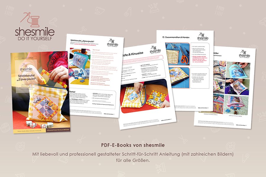 PDF-E-Books von shesmile: Diese leicht verständliche Schritt-für-Schritt-Anleitung mit vielen Fotos ist auch für Nähanfänger geeignet, denn die sehr ausführliche Fotoanleitungen begleitet dich bei jedem Schritt.