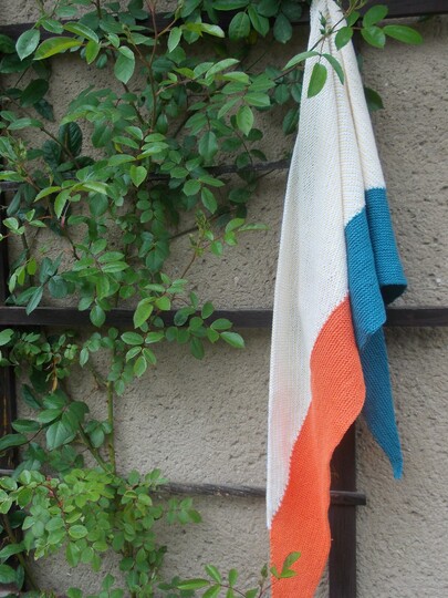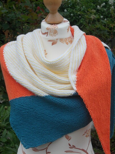 Das Sommertuch "Dreigeteilt" wird aus reiner Baumwolle in kräftigen Farben kraus rechts gestrickt, und es macht einfach nur gute Laune.