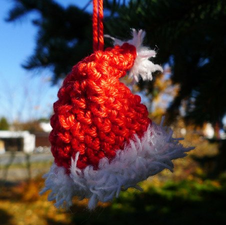 wie Du ganz einfach süße Weihnachtsmannmützen für den Christbaum häkelst.